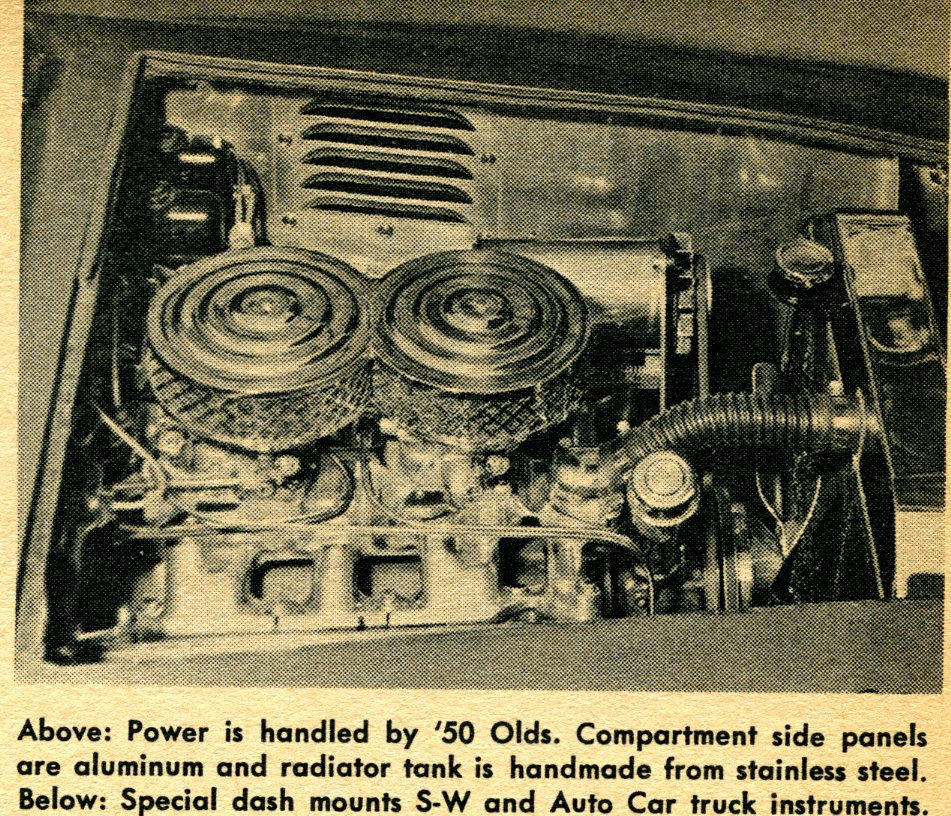 The power department is capably handled by a ’50 Olds engine which builder Scott has mildly reworked. The engine is stock as far as bore and stroke are concerned, but gains some extra push from a ¾ Mellings cam and dual four barrel carbs. The ports are polished and matched, valves are stock, and hydraulic lifters actuate them.