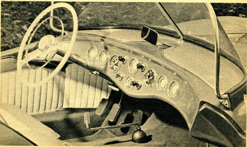 The instruments are mainly Stewart-Warner and some are from an AutoCar truck panel. The steering is from a ’55 Nash while the steering wheel is from a 190 Mercedes-Benz. The interior of the car was cut and fitted by the owner and sewn by Al Minninghausen, an upholster of Mt. Holly, New Jersey.