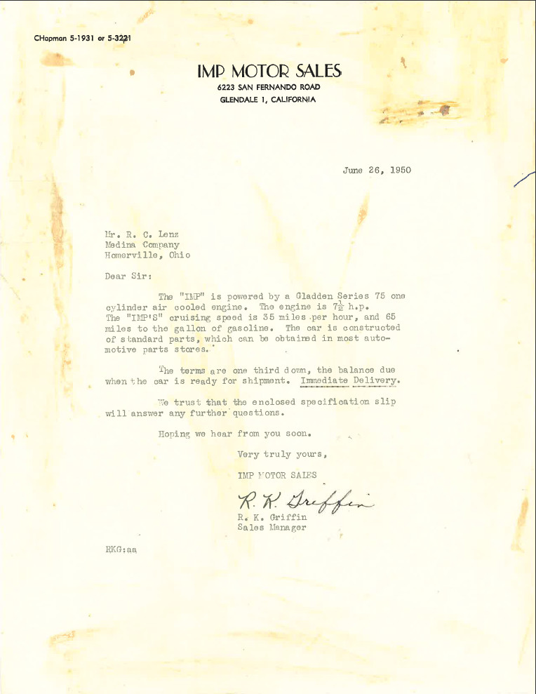 Letter From Imp Motor Sales, From R. K. Griffin (June 26th, 1950)