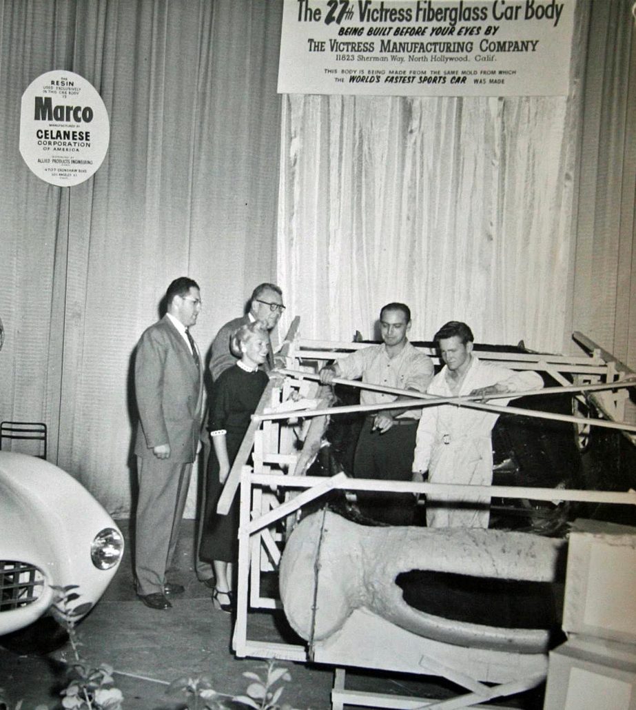 - Here’s A Great Photo From the ’53 Petersen Motorama Showing Doc Boyce-Smith and Bill Quirk Inside The Victress Mold. Outside is Ted Kelly – Wearing Glasses. The Other Two Folks Near Ted Kelly May Be Celanese Representatives (Manufacturers of Resin Sold By Ted Kelly’s Company, Allied).
