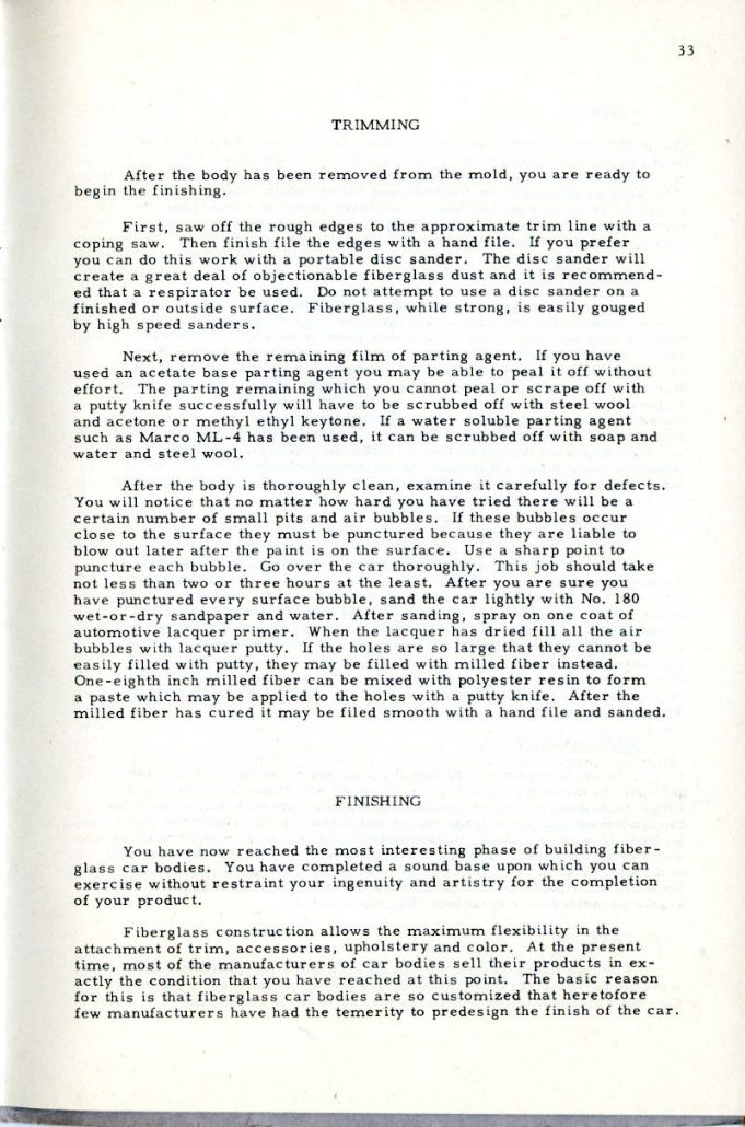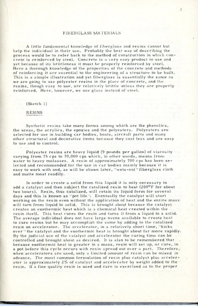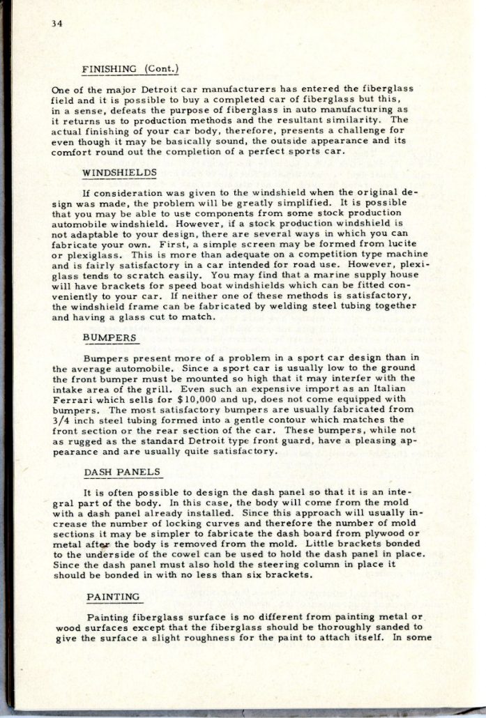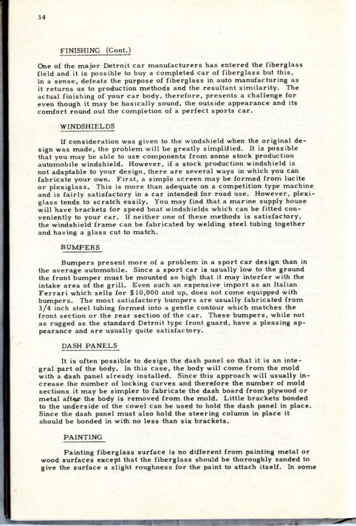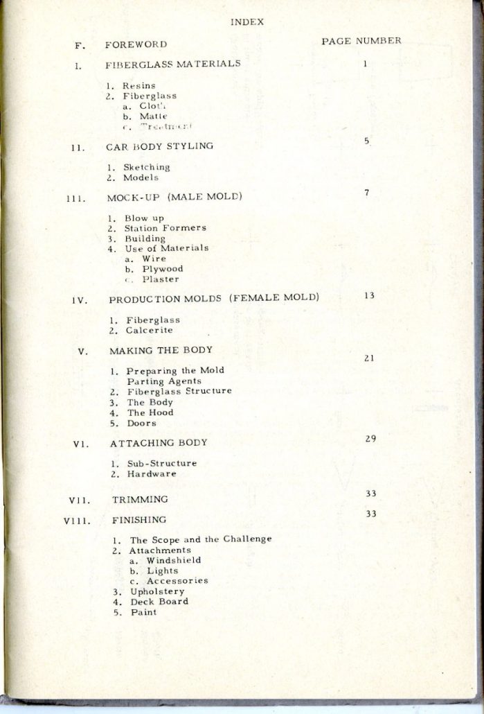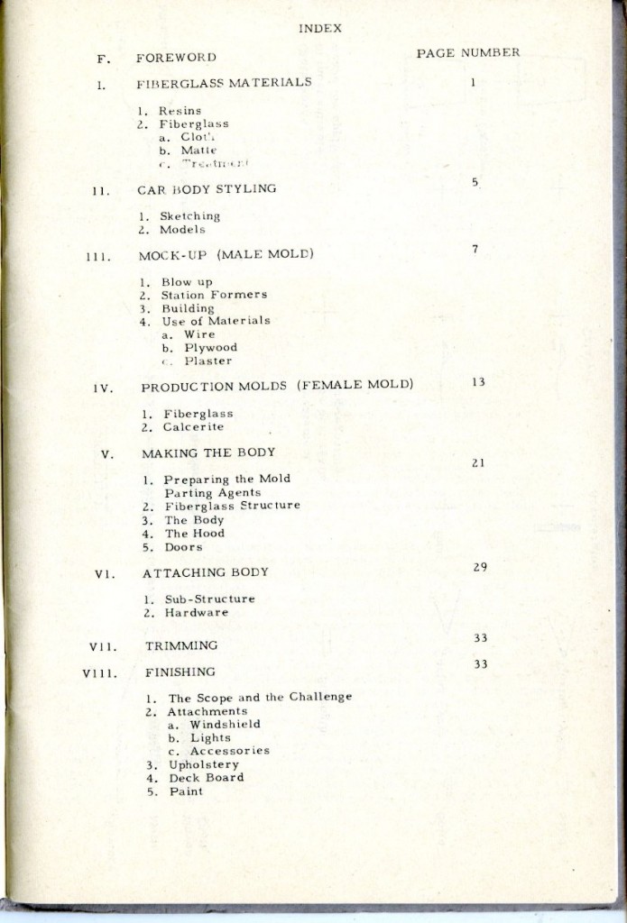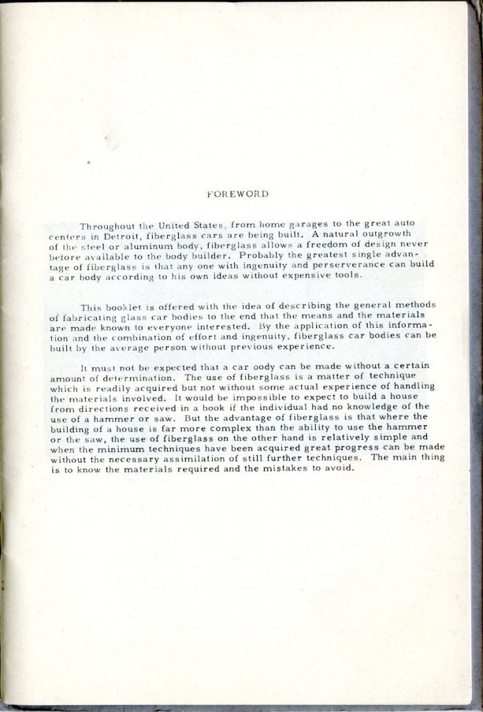 This booklet is offered with the idea of describing the general methods of fabricating glass car bodies to the end that the means and the materials are made known to everyone interested. By the application of this information and the combination of effort and ingenuity, fiberglass car bodes can be built by the average person without previous experience.