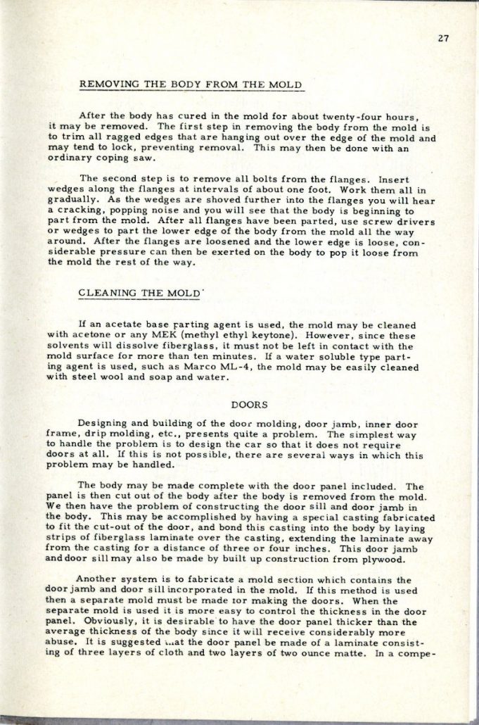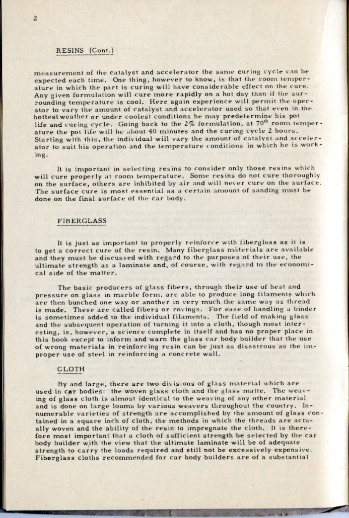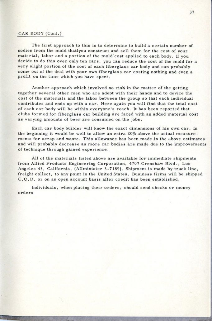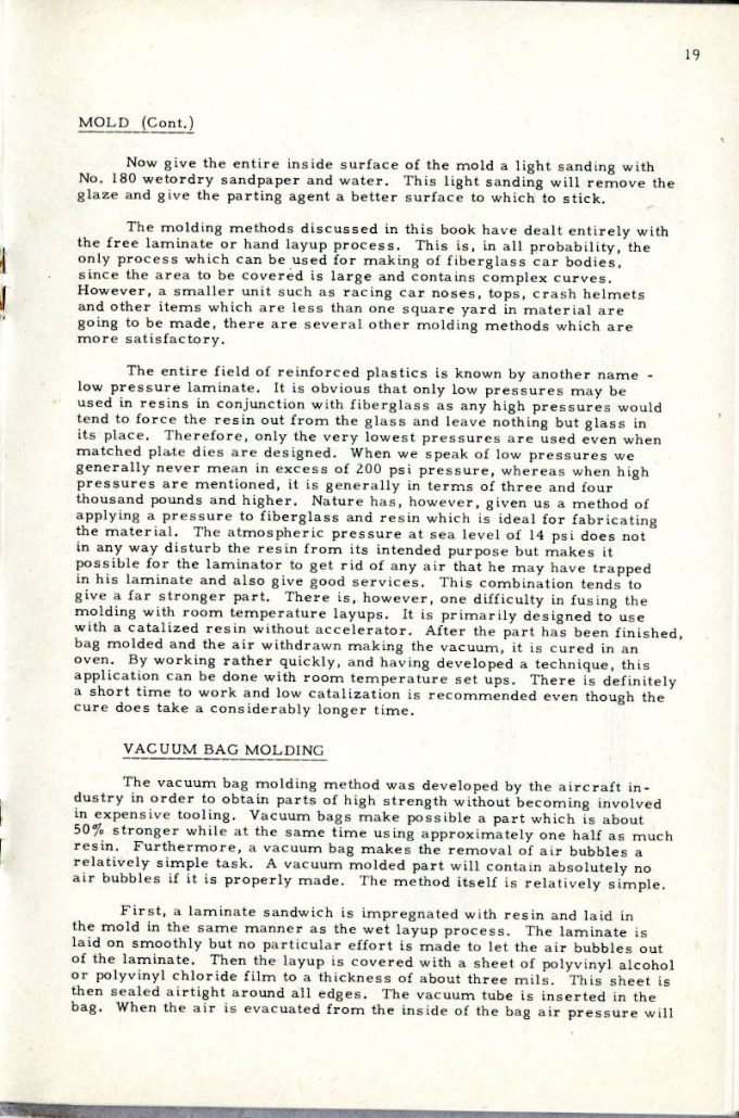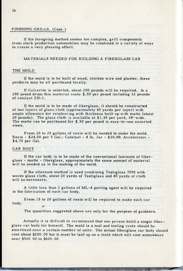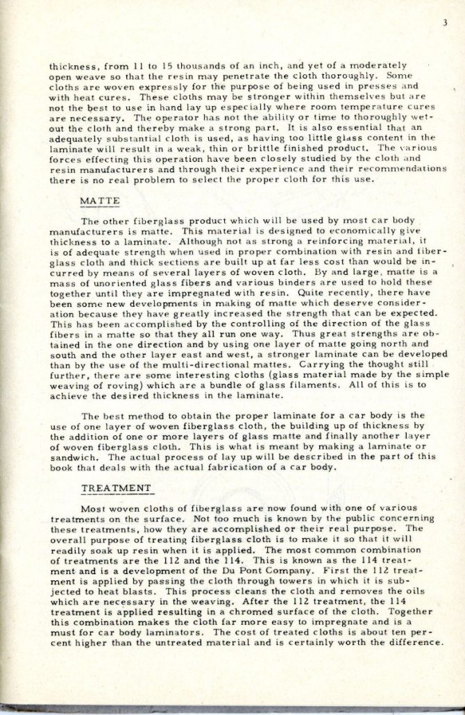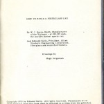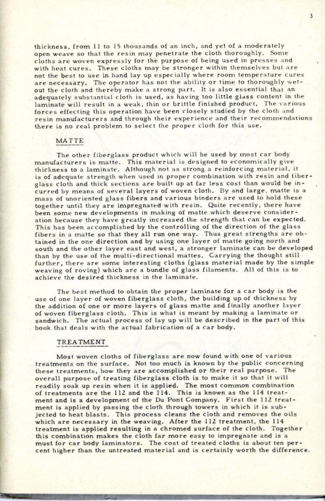 This booklet is offered with the idea of describing the general methods of fabricating glass car bodies to the end that the means and the materials are made known to everyone interested. By the application of this information and the combination of effort and ingenuity, fiberglass car bodes can be built by the average person without previous experience.