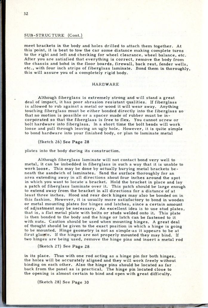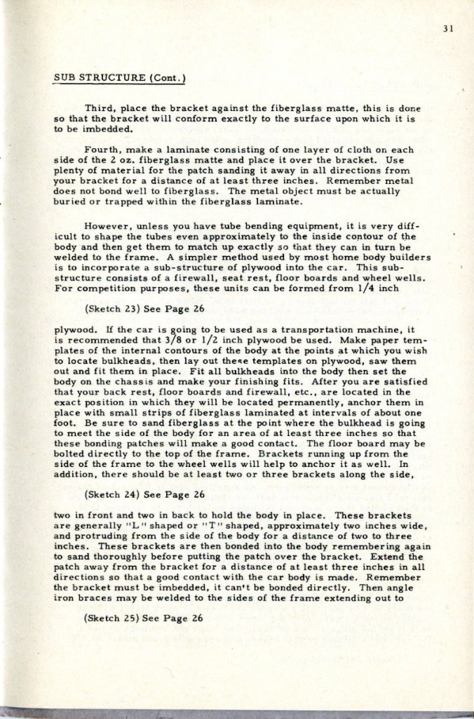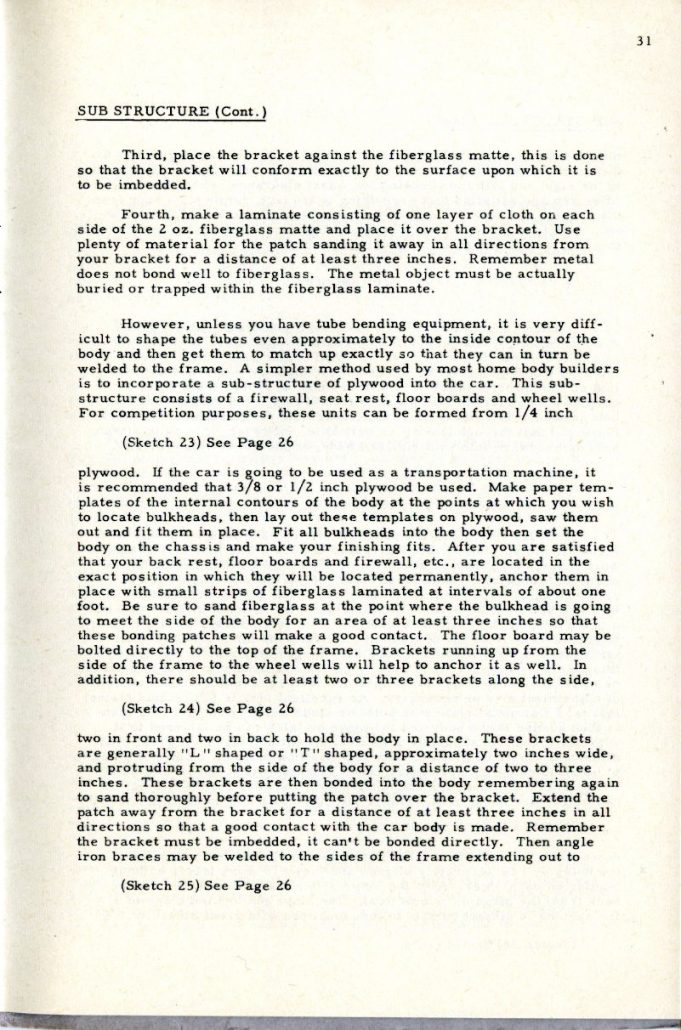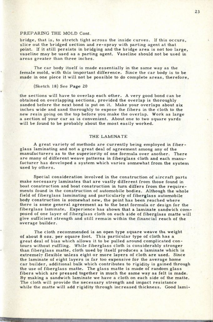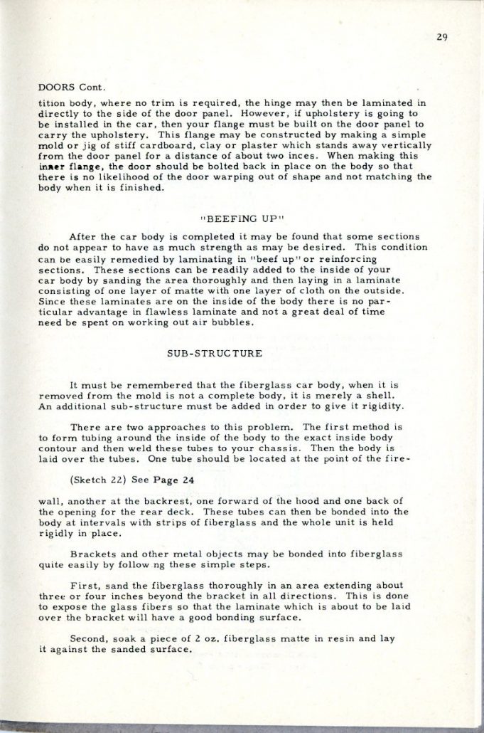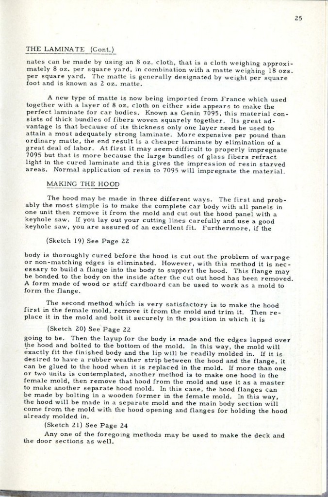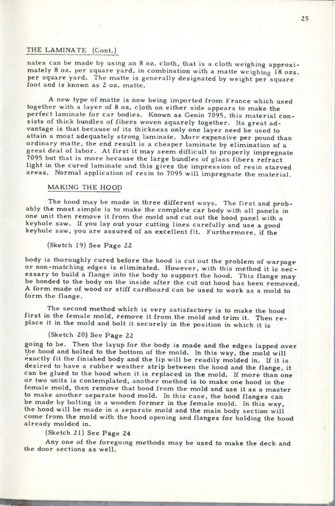 This booklet is offered with the idea of describing the general methods of fabricating glass car bodies to the end that the means and the materials are made known to everyone interested. By the application of this information and the combination of effort and ingenuity, fiberglass car bodes can be built by the average person without previous experience.