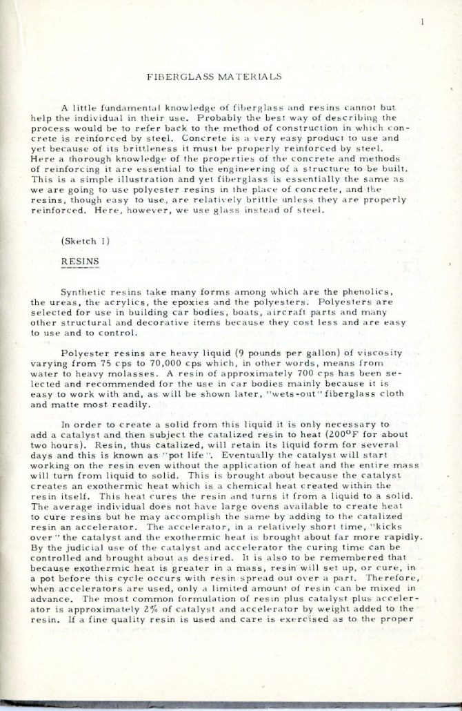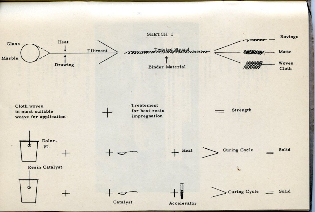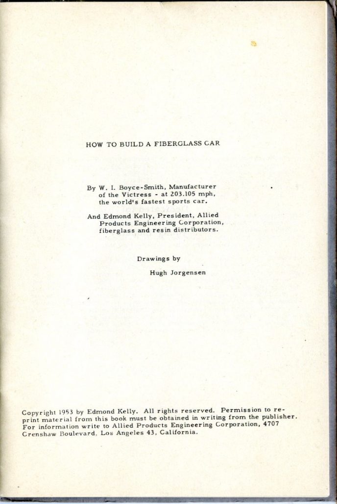 This is a remarkable booklet, first published in ’53 by Doc Boyce-Smith, president of Boyce Smith Company (later Victress Manufacturing) and Edmond “Ted” Kelly, President of Allied Products Engineering Corporation and primary supplier of resin and fiberglass materials to Victress. (Note: In later years after Ted Kelly’s company, Allied Products Engineering Corporation closed (around 1955), Victress switched to Thalco for their supplier of everything fiberglass).
