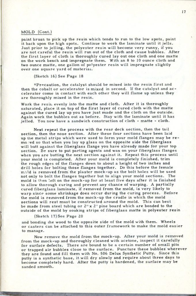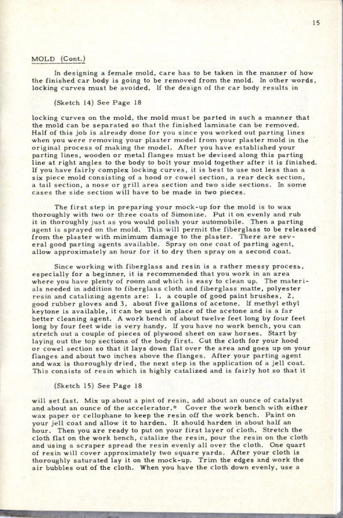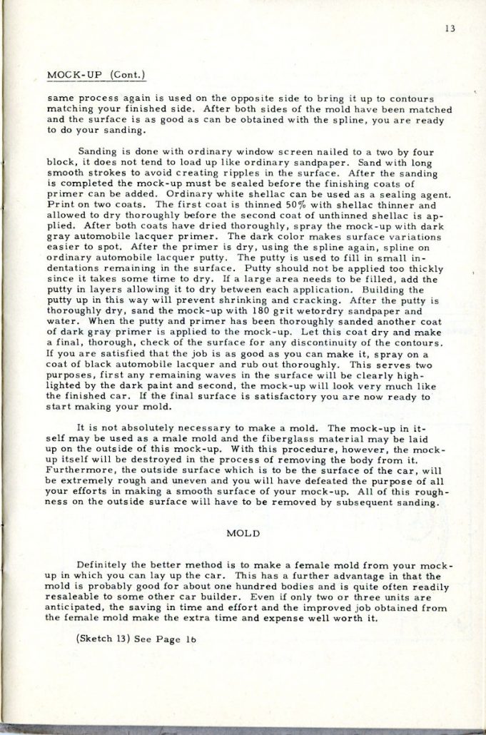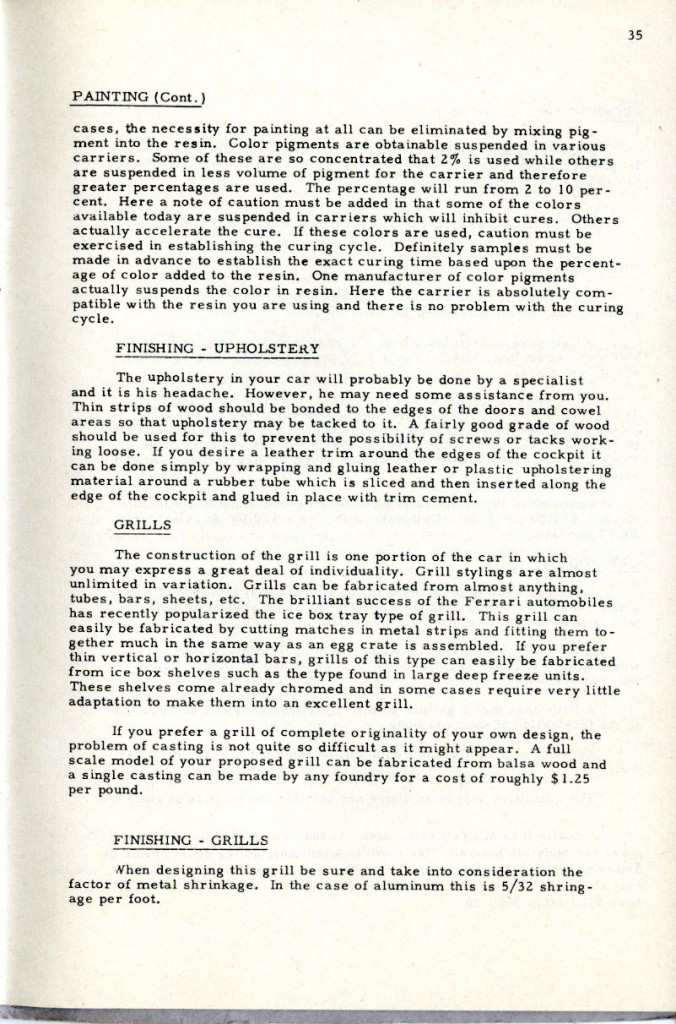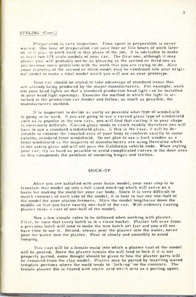 It must not be expected that a car body can be made without a certain amount of determination. The use of fiberglass is a matter of technique which is readily acquired but not without some actual experience of handling the materials involved. It would be impossible to expect to build a house from directions received in a book if the individual had no knowledge of the use of a hammer or saw.