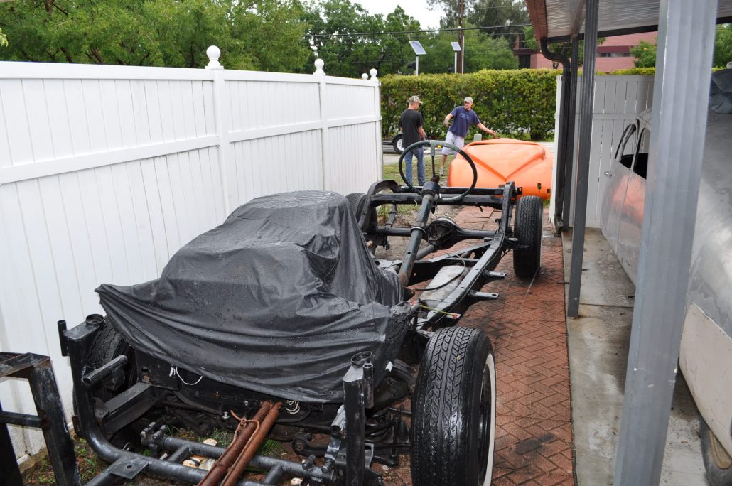 Getting the chassis ready for mounting the body took some time, but this past weekend we were ready to go. Recently, you found out about our “Moving Day” which took quite a bit of effort to pluck the body from the garage (conveniently located at the farthest point back and behind all the other cars), so last week the Maverick body and chassis were reunited at my house – at least they were placed just mere feet from one another.