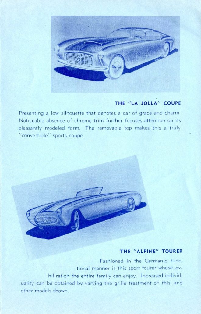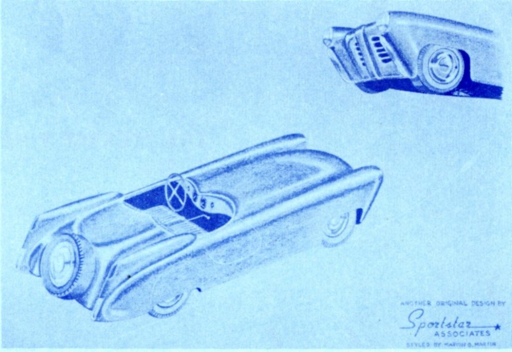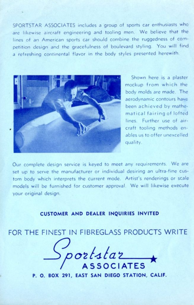 “SPORTSTAR ASSOCIATES includes a group of sports car enthusiasts who are likewise aircraft engineering and tooling men. We believe that the lines of an American sports car should combine the ruggedness of competition design and the gracefulness of boulevard styling. You will find a refreshing continental flavor in the body styles presented herewith.”