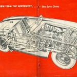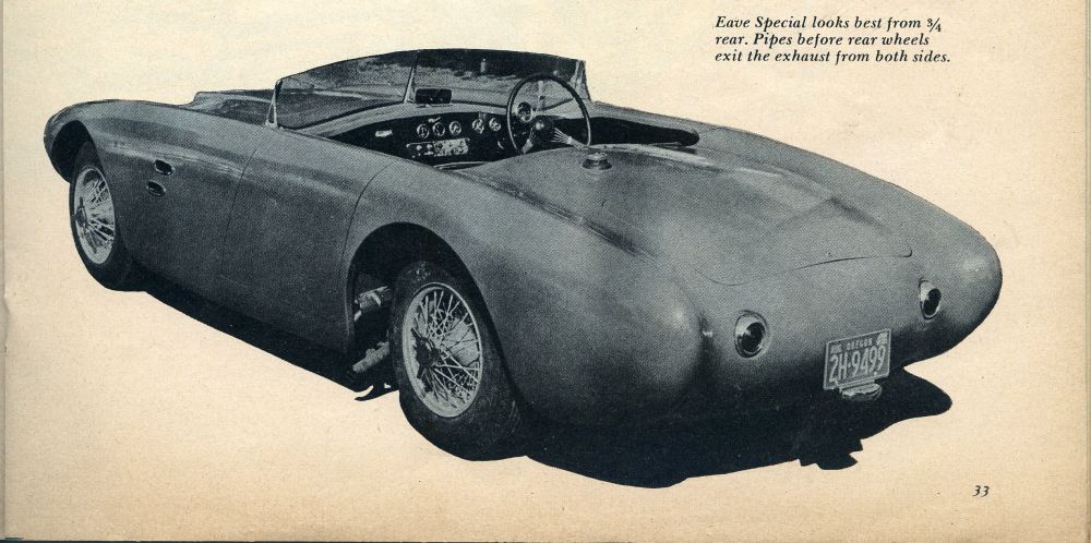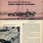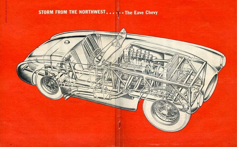 The appearance in Northwest racing circles of a bright red roadster bearing a resemblance to several expensive European racing cars has set tongues to wagging. The most consisent rumor has it that a very wealthy Portland, Oregon manufacturer has taken delivery of a custom-built 4.9 with which he intends to waylay the Carsten’s HWM, the Fogg Cad-Allard, etc., etc. The truth of the matter is that the sleek, hungry-looking job is the latest special built by Larry Eave, a lifelong resident of Portland. It’s true that the lines of the body had their origin in the land of red wine and buxom women, but other than that the guts of this one-of-a-kind road racing machine are as American as the Chevrolet automobile.
