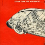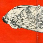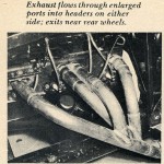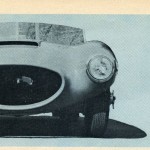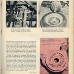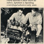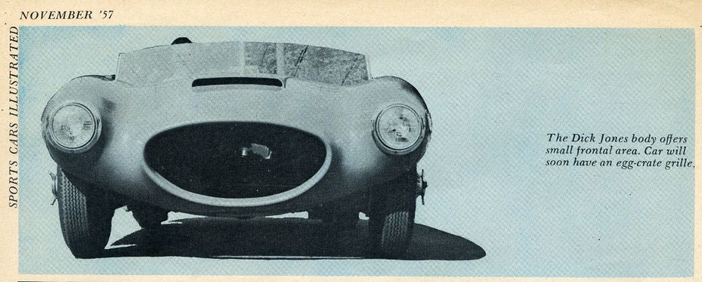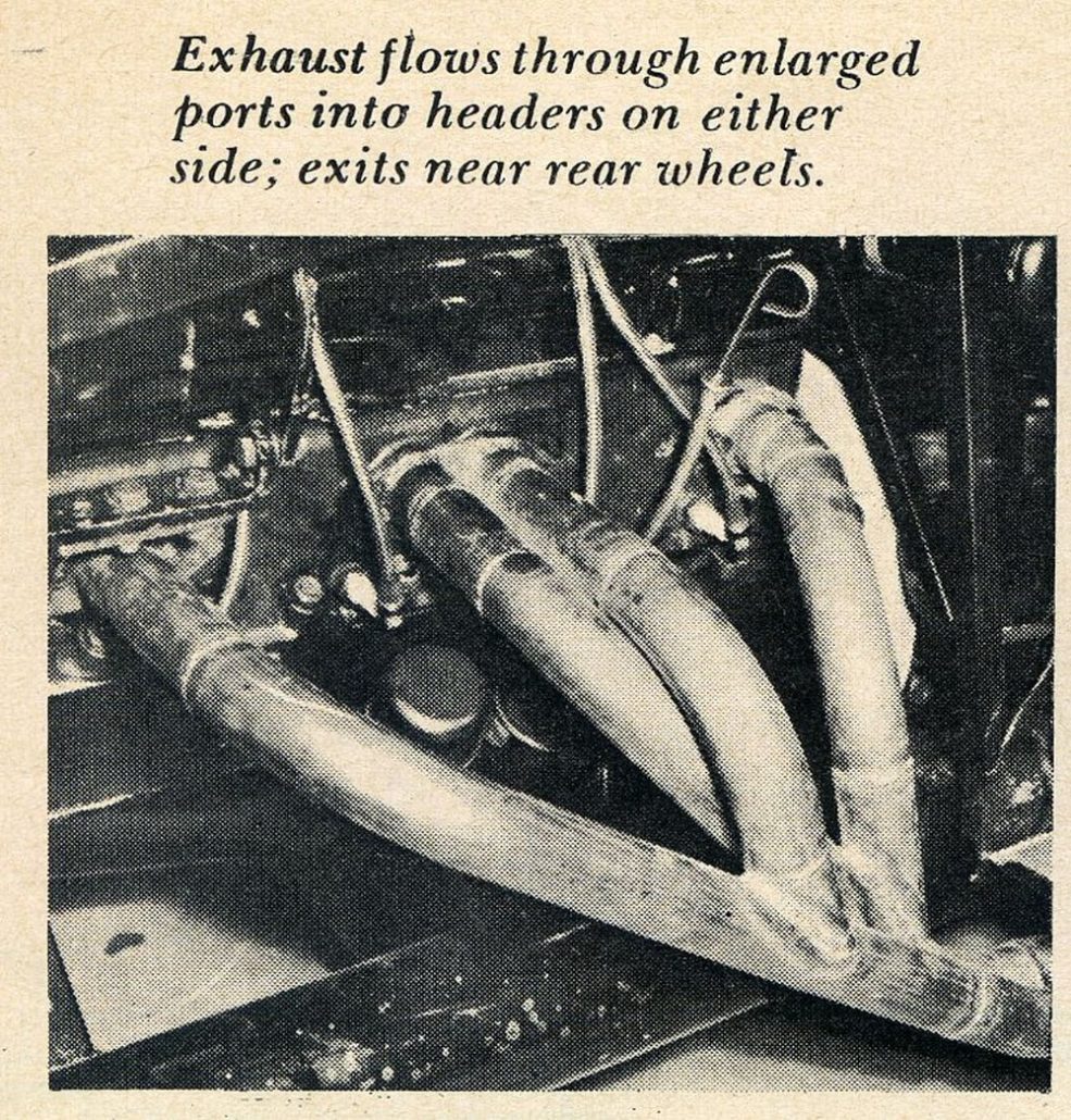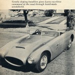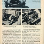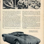 The 0-60 run took but 6 seconds, and the speedometer needle wiped the face in a steady sweep to a 140 reading. The engine reved happily through gears–plenty willing to exceed 7200 RPM. Handling was excellent after several changes had been made in caster and camber. The car felt terrific when powered through the turns, and when broken loose it drifted with a feeling of stability and control. All up weight scaled 2000 pounds, with 48% front and 52% rear.
