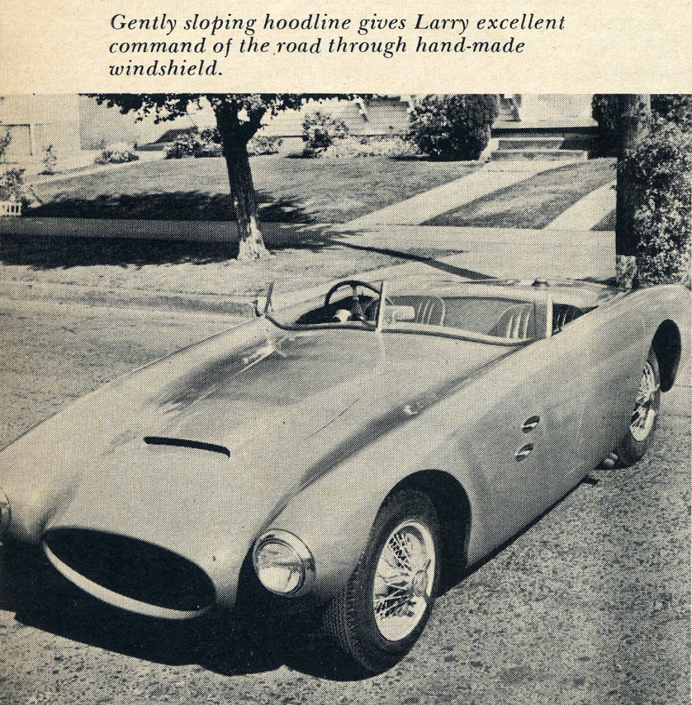Ordinarily these day dreams, or rather after-race dreams, would go no further; but Larry is no ordinary guy. Though he is now a white collar man, the business of building cars was not new to him. He had cut his pinkies on the over-stressed inserts of a couple of quick strokers run in the savage glare of the Bonneville salt. Even the sports car kick was not new. He had stuffed an Olds in a set of his own rails, and though it lacked road manners, it taught him a lot about suspension, metals and weight distribution. The big difference in the development of this car, compared with his other automotive ventures, was in the planning stage.