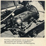 An Auburn 10-inch clutch was bolted onto the flywheel and the power package held over the frame while the mounts were readied. A Ford side-shift box was to support the back of the power plant, so the two were bolted together (using an adapter housing) and dropped in place.