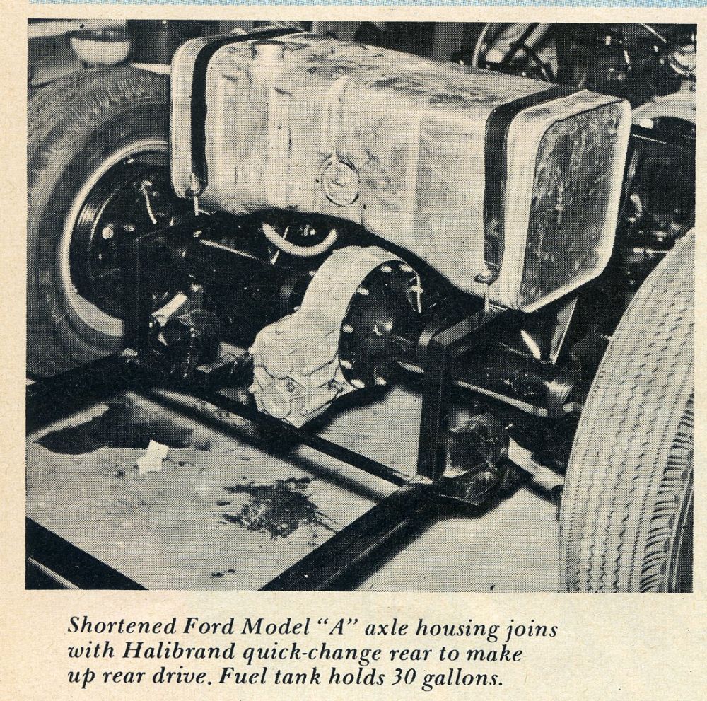 For lightness and, at the same time, strength, a set of Ford Model A rear axle housings were to be used for the rear axle and the Halibrand quick-change center section. These were shortened 3 1/2 inches per side. The modified axles and housings were mounted on a pair of longitudinal torsion bars. The rear radius rods could not be attached to the torque tube, since the latter was to be drastically shortened to accomodate the 98.5 inch wheelbase. Full floating anchors were made up and welded to the main frame.
