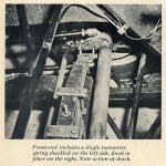The Withey-designed front suspension, consisting of a straight two-inch tube suspended on a 9 leaf transverse spring, was shackled to a pillar fabricated from steel plate and welded to the center of the front crossmember. The design had been successfully worked out on a midget racer built by Orville some years before. Like so many of the good designs in racing, this layout was simple, yet light and strong.
