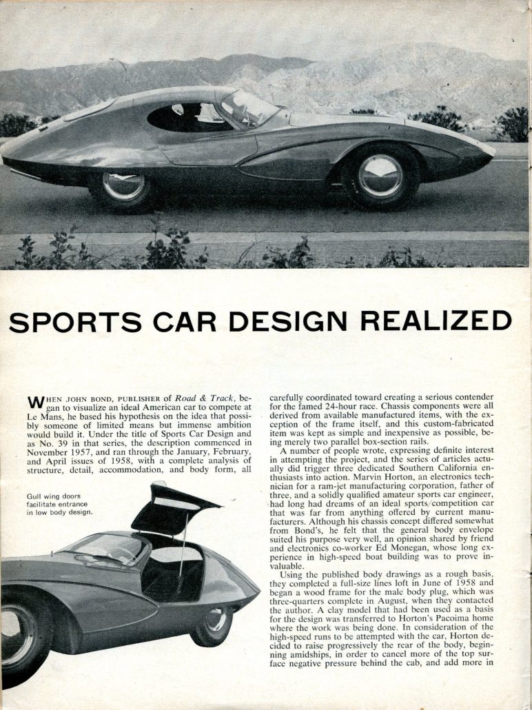 When John Bond, publisher of Road & Track. began to visualize an ideal American car to compete at Le Mans, he based his hypothesis on the idea that possibly someone of limited means but immense ambition would build it. Under the title of Sports Car Design and as No. 39 in that series, the description commenced in November 1957, and ran through the January, February, and April issues of 1958, with a complete analysis of structure, detail, accommodation, and body form, all carefully coordinated toward creating a serious contender for the famed 24-hour race. Chassis components were all derived from available manufactured items, with the exception of the frame itself, and this custom-fabricated item was kept as simple and inexpensive as possible, being merely two parallel box-section rails.