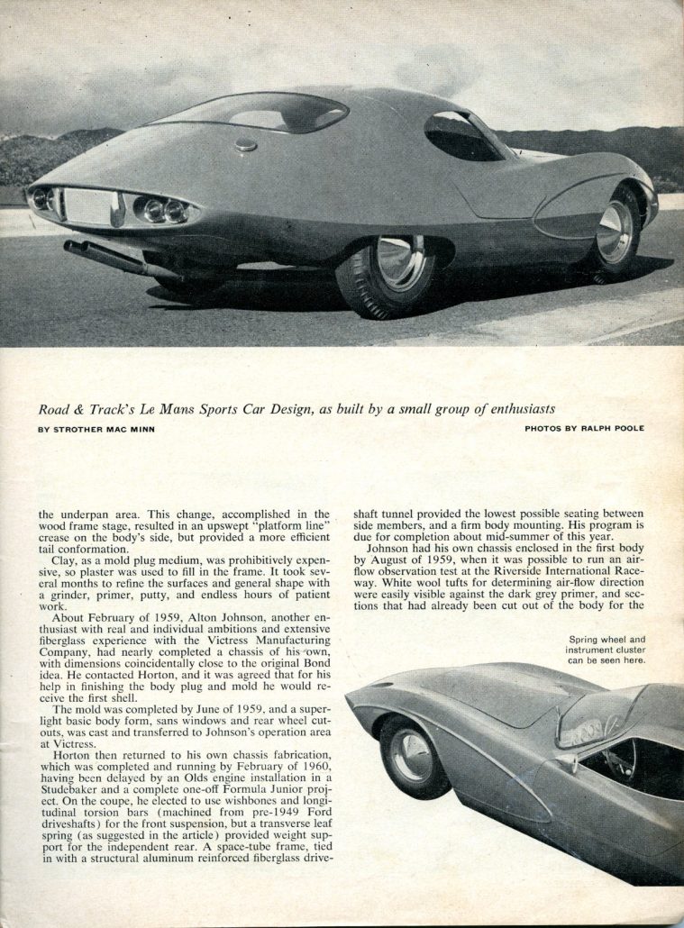 About February of 1959, Alton Johnson, another enthusiast with real and individual ambitions and extensive fiberglass experience with the Victress Manufacturing Company, had nearly completed a chassis of his own, with dimensions coincidentally close to the original Bond idea. He contacted Horton, and it was agreed that for his help in finishing the body plug and mold he would receive the first shell.