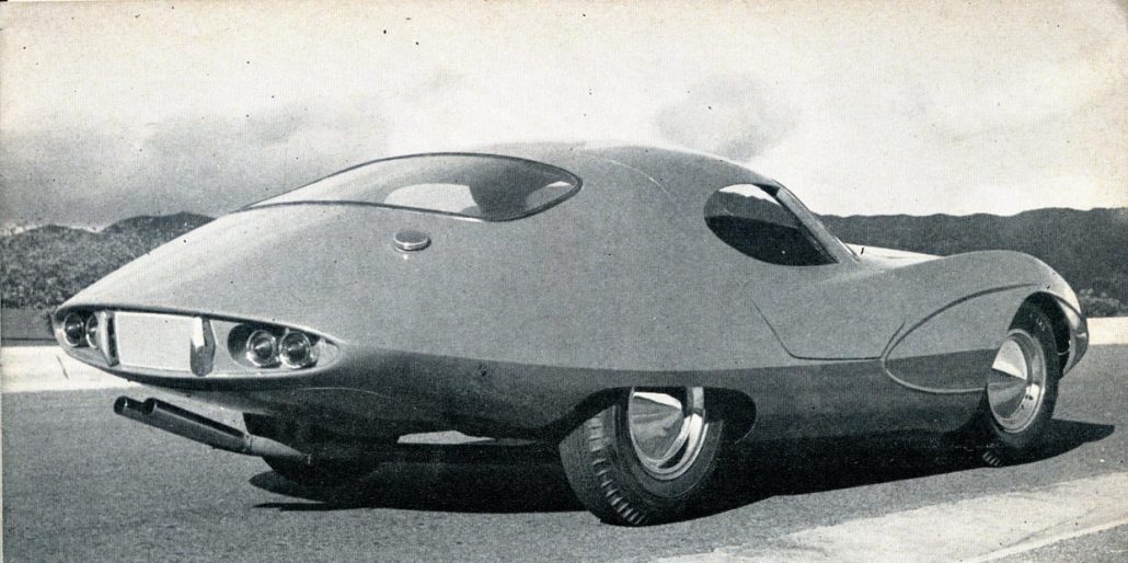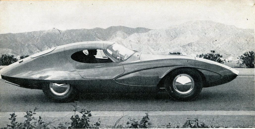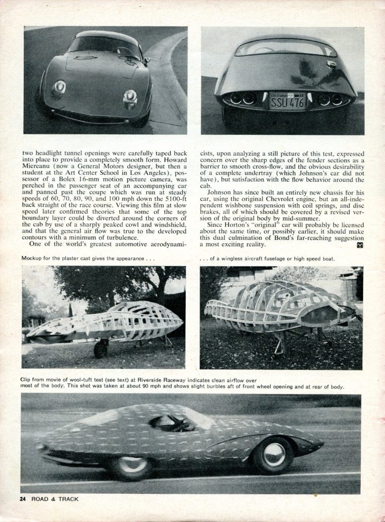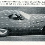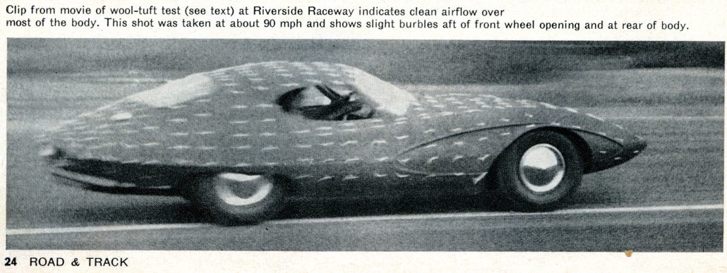 Howard Miereanu (now a General Motors designer, but then a student at the Art Center School in Los Angeles), possessor of a Bolex 16-mm motion picture camera, was perched in the passenger seat of an accompanying car and panned past the coupe which was run at steady speeds of 60, 70, 80, 90, and 100 mph down the 5,100-ft back straight of the race course. Viewing this film at slow speed later confirmed theories that some of the top boundary layer could be diverted around the corners of the cab by use of a sharply peaked cowl and windshield, and that the general air flow was true to the developed contours with a minimum of turbulence.
