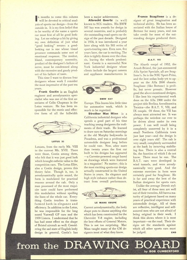 What a wonderfully written way to describe the beauty of style done right.  Cumberford went on to review the Lotus 11, BMW 507, BAT VII, and Mac’s LeMans Coupe.  Let’s see what he had to say about the car we are discussing today: