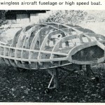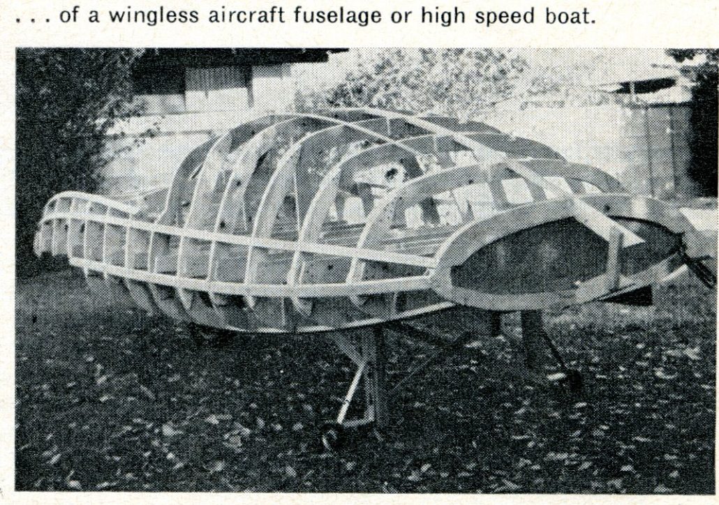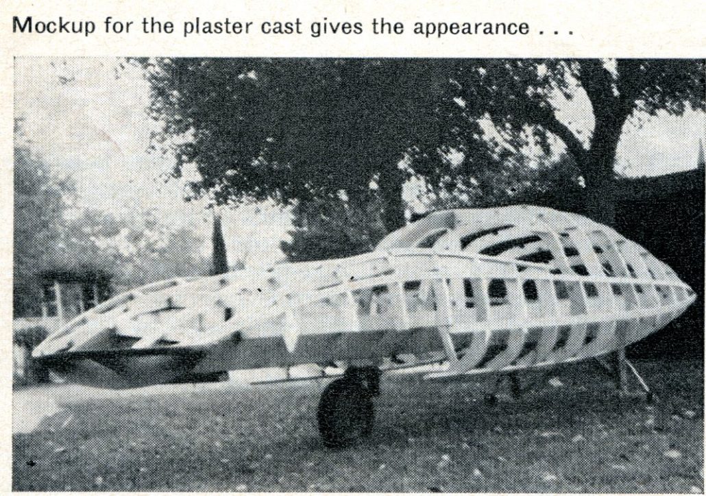 Caption: Mockup for the plaster cast gives the appearance of a wingless aircraft fuselage or high speed boat.