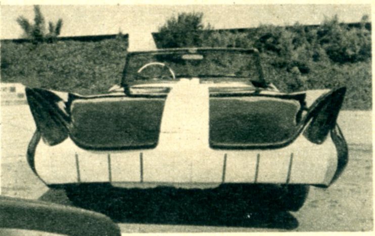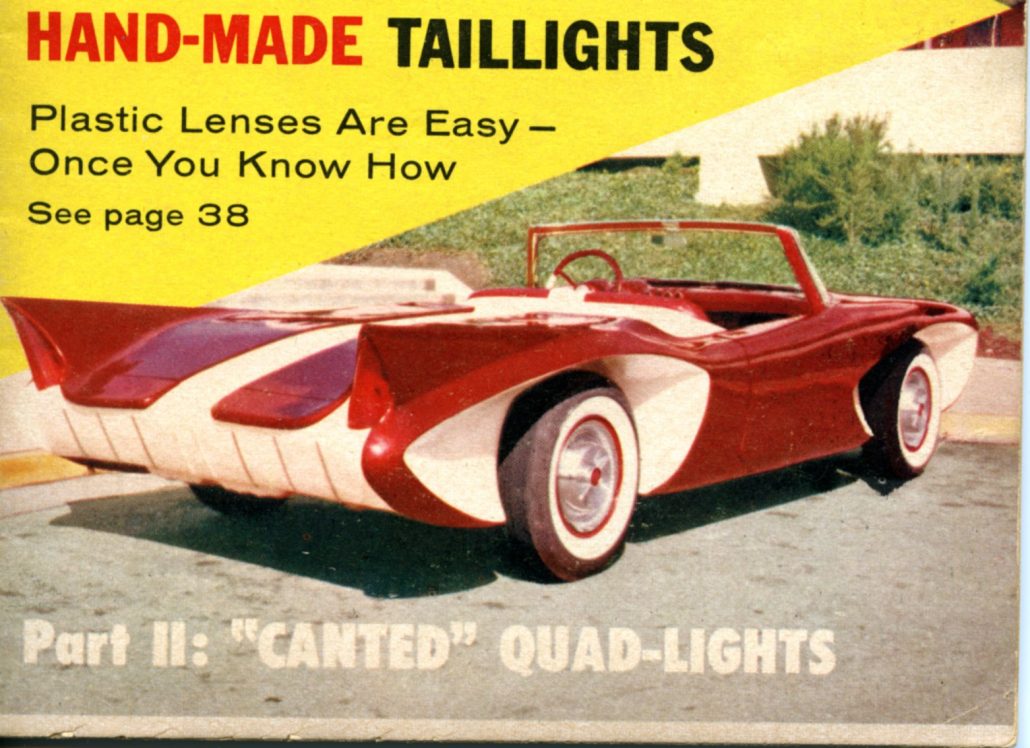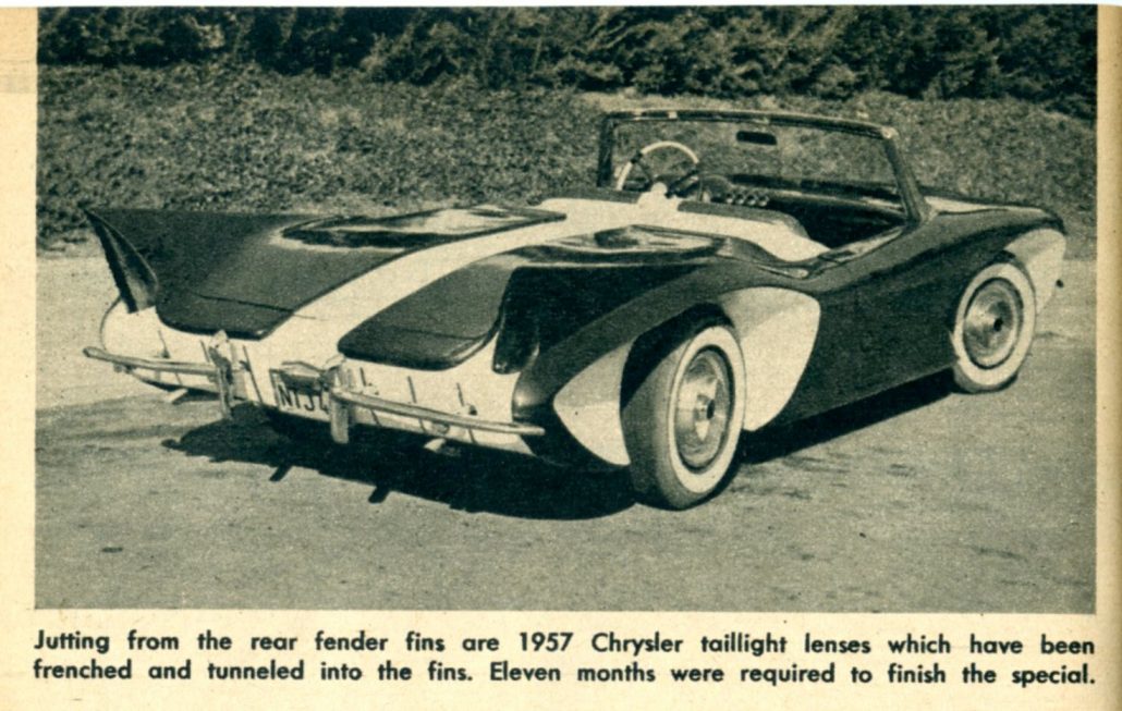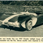 * Jutting from the rear fender fins are 1957 Chrysler taillight lenses which have been frenched and tunneled into the fins. Eleven months were required to finish the special.