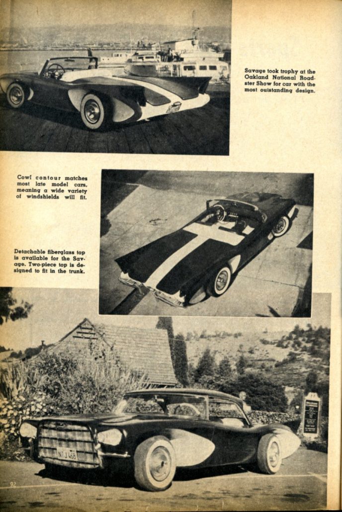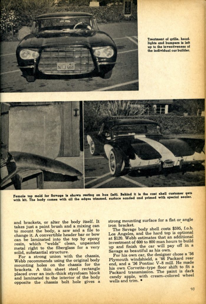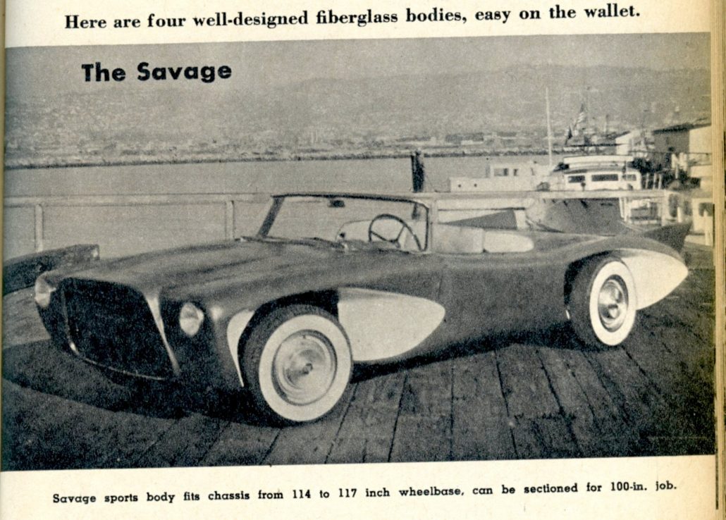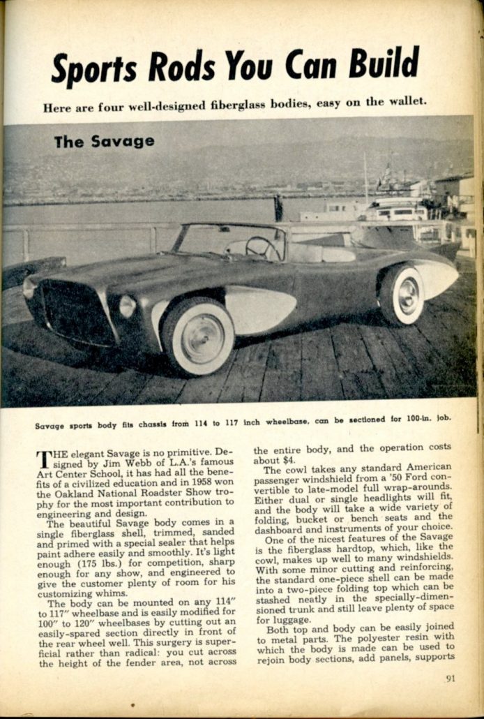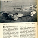“The elegant Savage is no primitive. Designed by Jim Webb of L.A.s famous Art Center School, it has had all the benefits of a civilized education and in 1958 won the Oakland National Roadster Show trophy for the most important contribution to engineering and design.”
