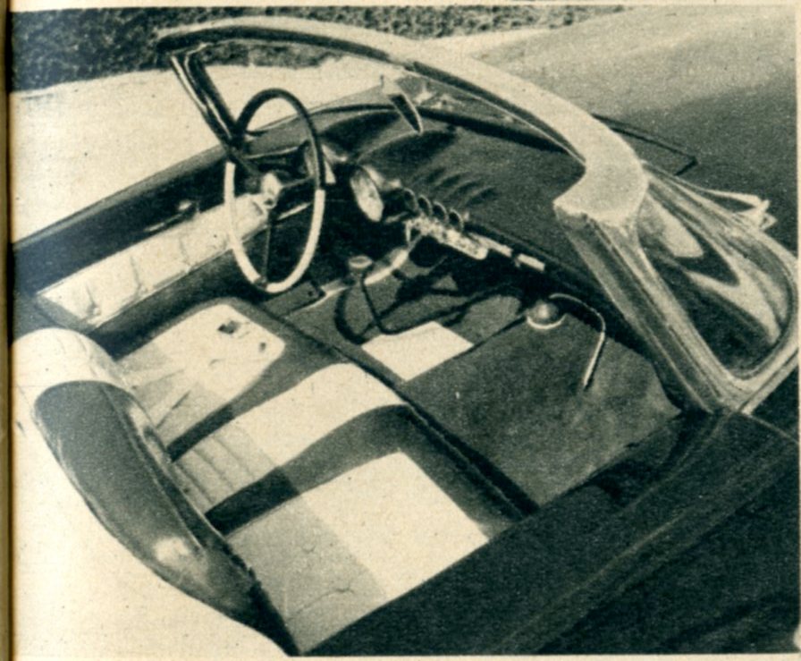 For his own car, the designer chose a ’56 Plymouth windshield, a ’46 Packard rear end, and a ’56 Pontiac V-8 mill. He made his own Corvette-type floor shift to fit a Packard transmission. The paint is dark candy apple, with cream-colored wheel wells and trim.”