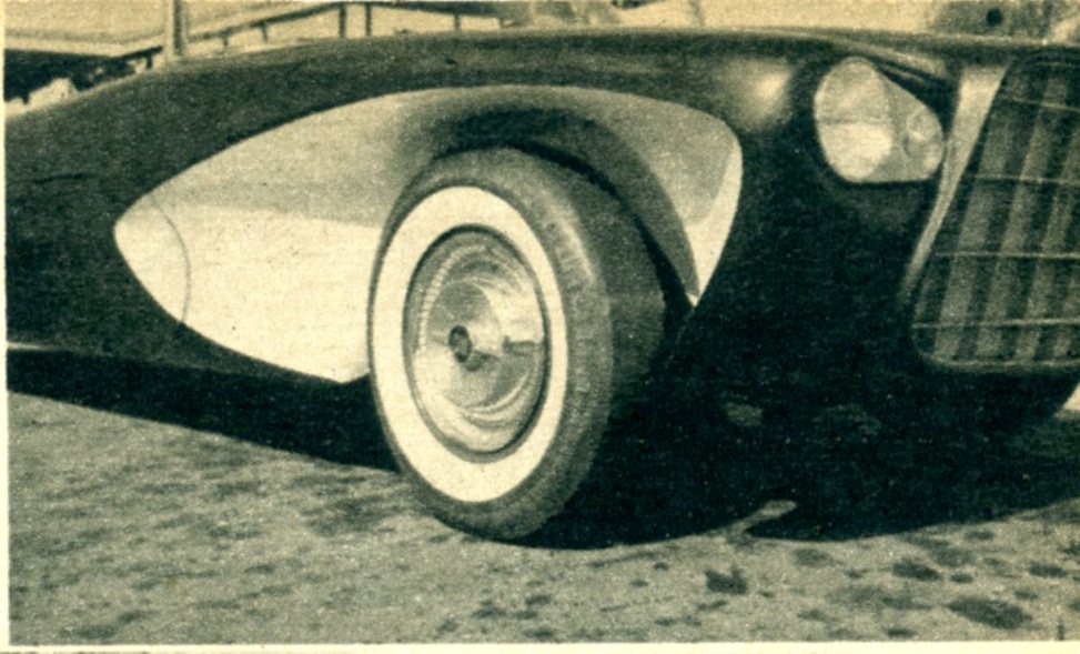 * Wheel wells exemplify sculptured styling carried out to extreme – offset by contrasting paint. The cut out portion of the fenders extends back to the door panel. Headlights are stock ’48 Chevy units with parking lights. Blunt styled grille uses 1 and ¼” flat steel bars with Ferrari checkerboard design; mesh screen backdrops.