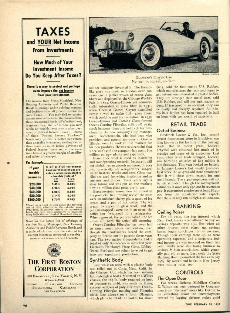 Look at how early the date of this magazine is gang…..February 18th, 1952. That’s less than 90 days from when fiberglass sports cars debuted at the November 1951 Petersen Motorama, and Glasspar was already making news in Time Magazine.