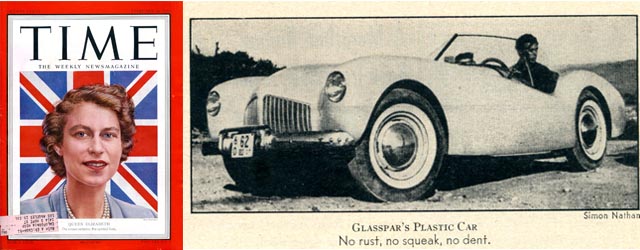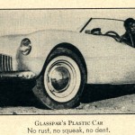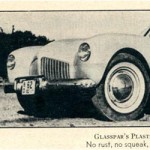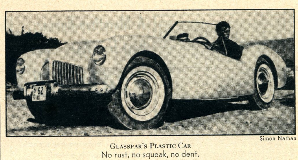 Last week, an auto with a plastic body was rolled out in Costa Mesa, California by the Glasspar Company, which has been making laminated glass boats. Mounted on a Willys chassis, the 185 lbs body required no heat or pressure to mold, was made by laying successive layers of polyester resin, Owens-Corning Fiberglas matting and Fiberglas cloth on a form.