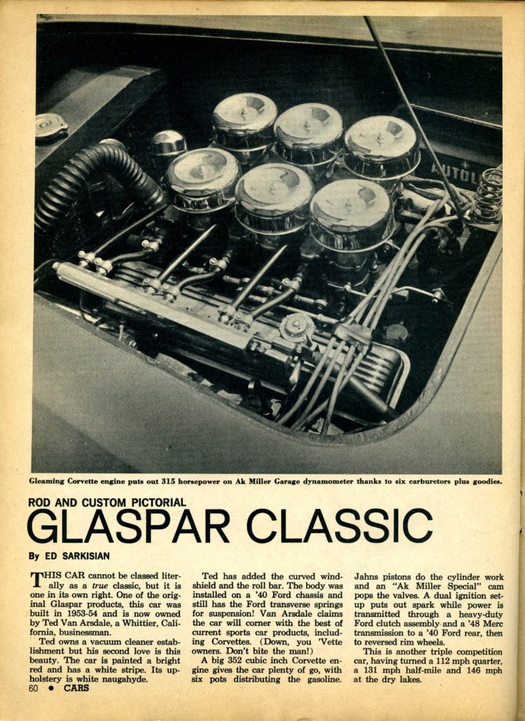 So….let’s take a look at what the article says, focus on that engine and its 6 carburetors, and learn more about Ted Van Arsdale’s Classic Glasspar G2.