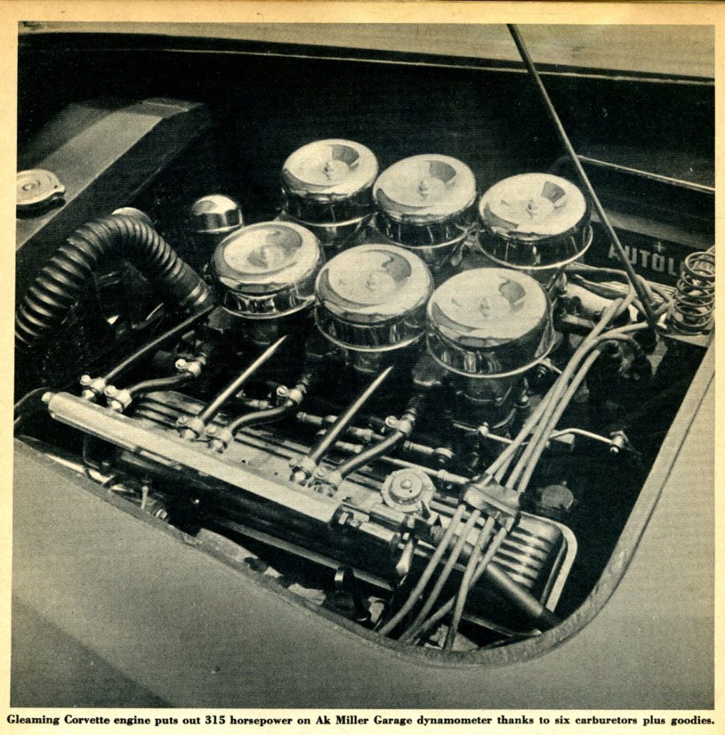 Caption: Gleaming Corvette engine puts out 315 horsepower on Ak Miller Garage dynamometer thanks to six carburetors plus goodies.