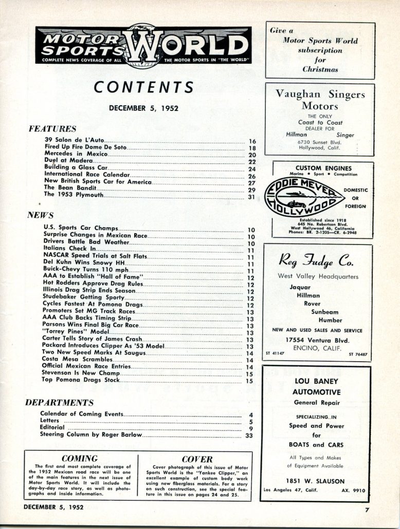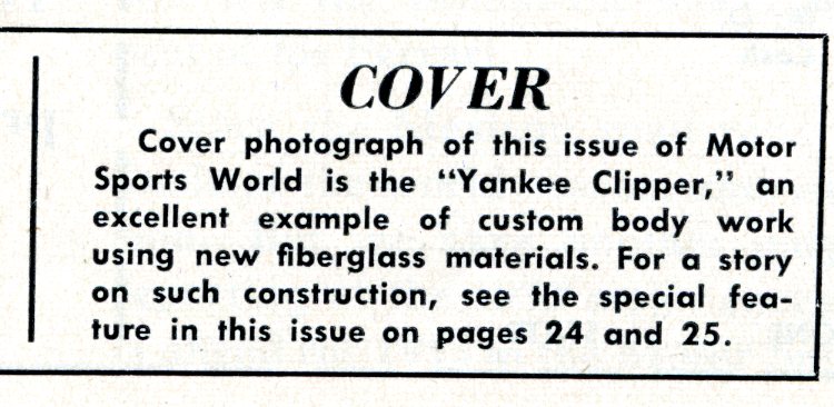 - Here The Yankee Clipper Appears On The Cover of the December 5th, 1952 Issue of Motor Sports World. The Only Mention Of It In The Magazine Was About The Cover Photo As Follows: “Cover photograph of this issue of Motor Sports World is the “Yankee Clipper,” an excellent example of custom body work using new fiberglass materials.”