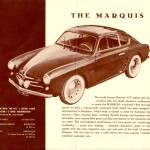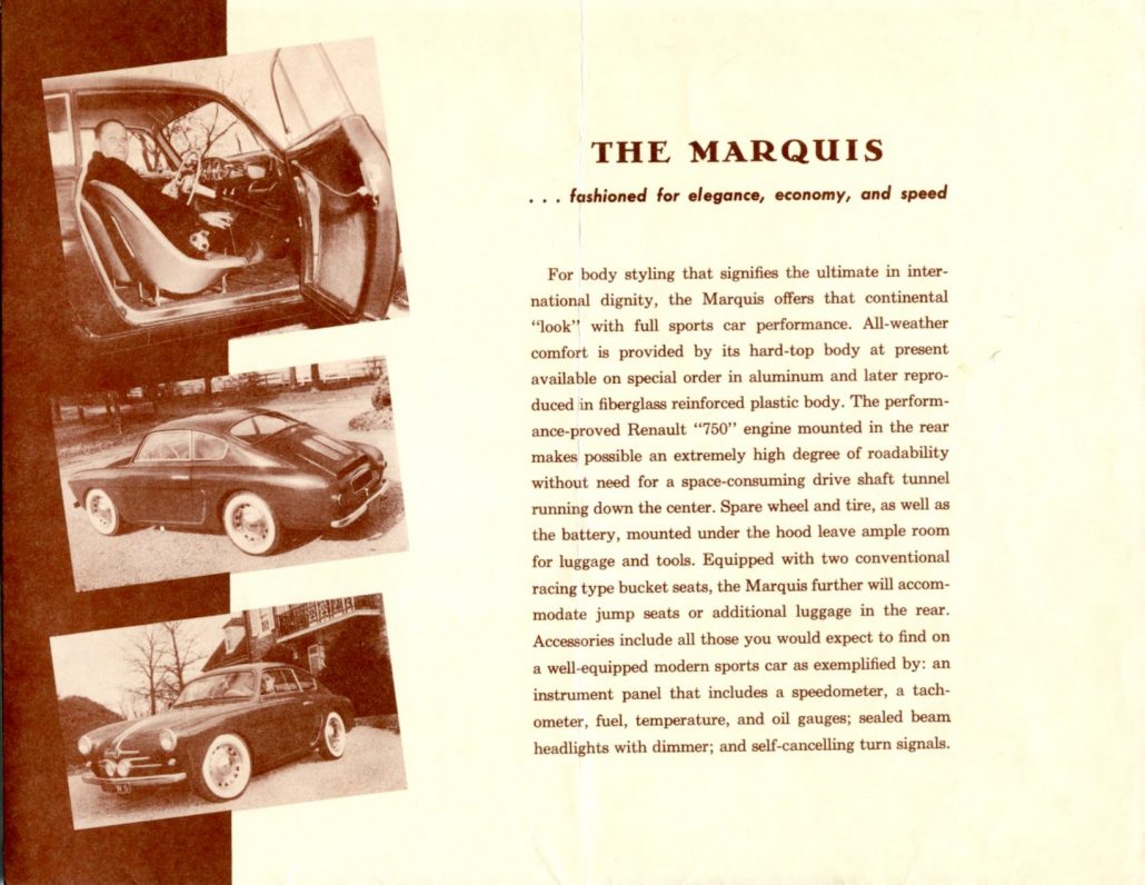 For body styling that signifies the ultimate in international dignity, the Marquis offers that continental “look” with full sports car performance. All-weather comfort is provided by its hardtop body at present available on special order in aluminum and later reproduced in fiberglass reinforced plastic body.