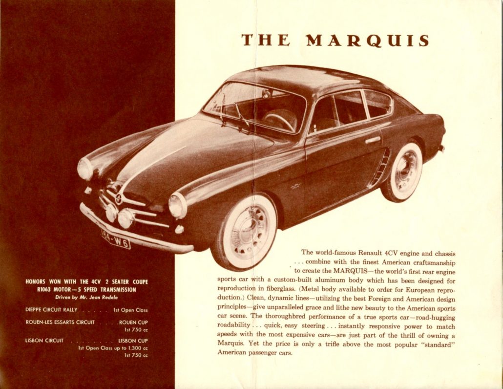 The world-famous Renault 4CV engine and chassis combine with the finest American craftsmanship to create the Marquis – the world’s first rear engine sports car with a custom-built aluminum body which has been designed for reproduction in fiberglass (metal body available to order for European reproduction.)