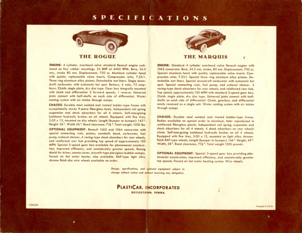 In this large-format 8 and 1/2 by 11 inch brochure, they introduced two cars that met this criteria: their sporty roadster called “The Rogue” and the stylish and elegant coupe called “The Marquis.” Click here to review an earlier story posted here on Forgotten Fiberglass concerning Plasticar’s Rogue.