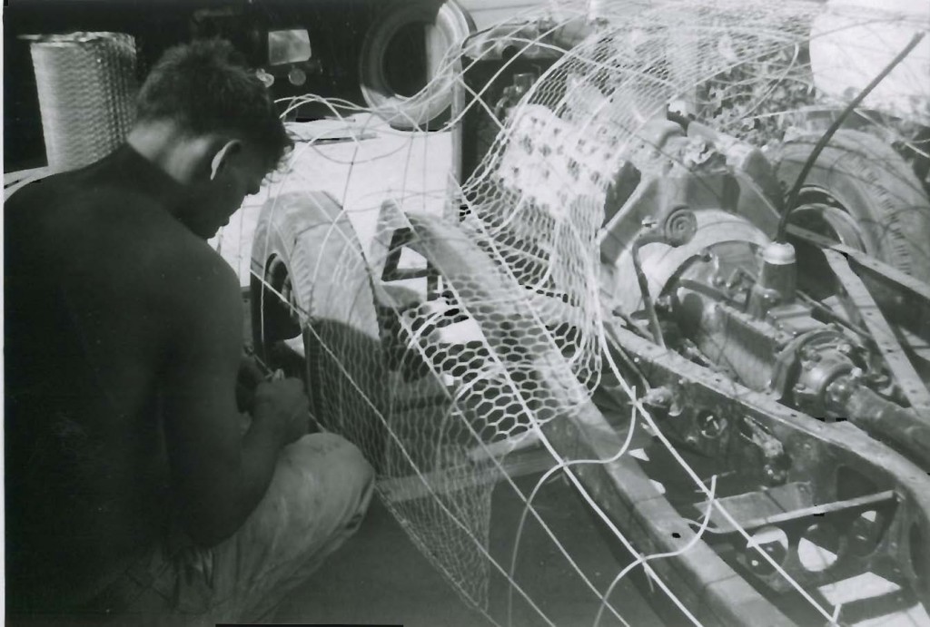 3 Published December 26, 2010 at 1346 × 909 in The 1955 Burch Roark Special – The Car That Nearly Was – And What A Car It Would Have Been! Here You See 20 Year Old Burch Roark Working on Fixing the Chicken Wire to the Heavy Gauge Wire that Would Serve as the Shape of His Body.