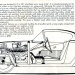 This gives a finished touch which many “specials” often lack, and is surprisingly inexpensive. Briefly, other salient features are a removable hardtop for all weather sports, a large engine compartment (which will accommodate any passenger car engine), a large trunk space and return flanges around wheels, grille, and cockpit openings.