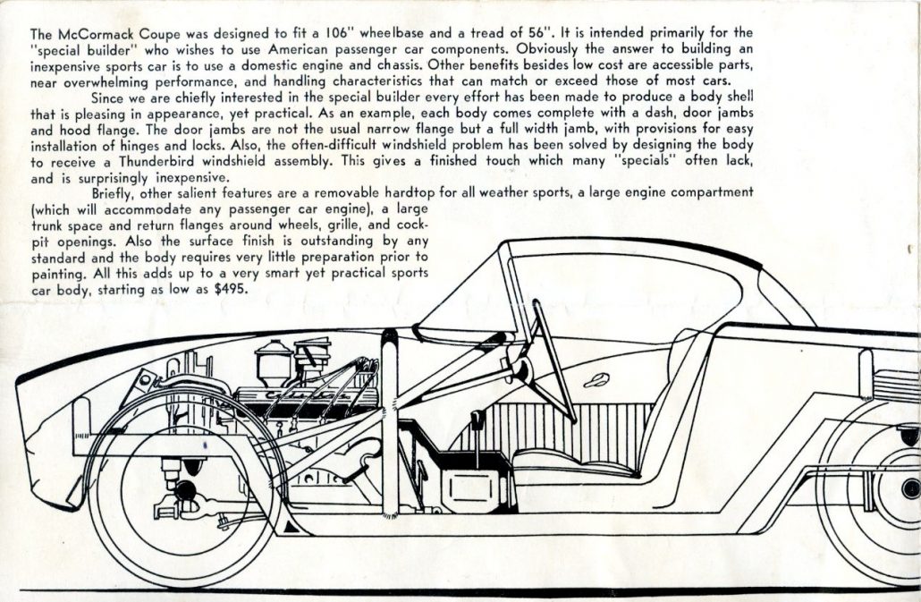 The McCormack Coupe was designed to fit a 106” wheelbase and a tread of 56”. It is intended primarily for the “special builder” who wishes to use American passenger car components. Obviously the answer to building an inexpensive sports car is to use a domestic engine and chassis.