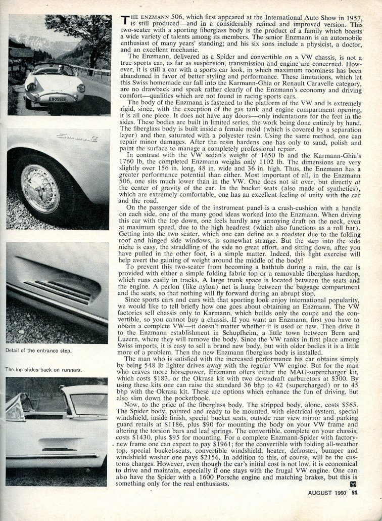 Since the VW ranks in first place among Swiss imports, it is easy to sell a brand new body, but with older bodies it is a little more of a problem. Then, the Enzmann fiberglass body is installed. The man who is satisfied with the increased performance his car obtains simply by being 548 lbs lighter drives away with the regular VW engine.