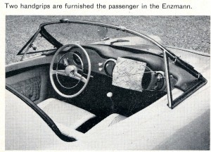 On the passenger side of the instrument panel is a crash-cushion with a handle on each side, one of the many good ideas worked into the Enzmann. When driving this car with the top down, one feels hardly any annoying draft on the neck, even at maximum speed, due to the high headrest (which also functions as a roll bar).