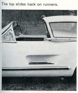 To prevent this two-seater from becoming a bathtub during a rain, the car is provide with either a simple folding fabric top or a removable fiberglass hardtop, which runs easily on tracks. A large trunk space is located between the seats and the engine.