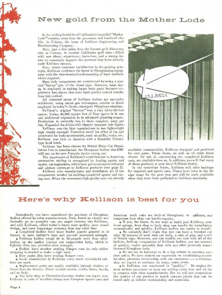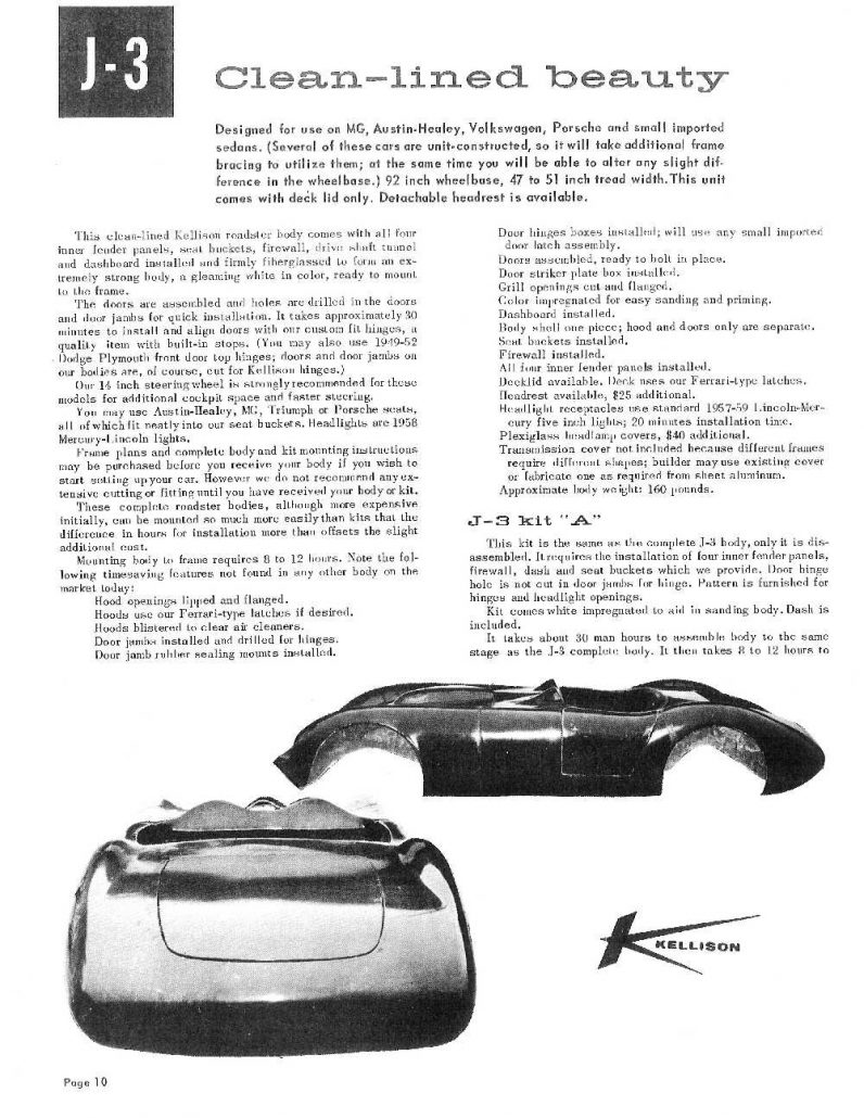 The 1960 Kellison catalog (8-1/2” x 11”) is 24 pages long, and stands out as being professionally created – one of the top catalogs the industry had at the time.  The fiberglass bodies presented in the 1960 catalog lists the following cars: