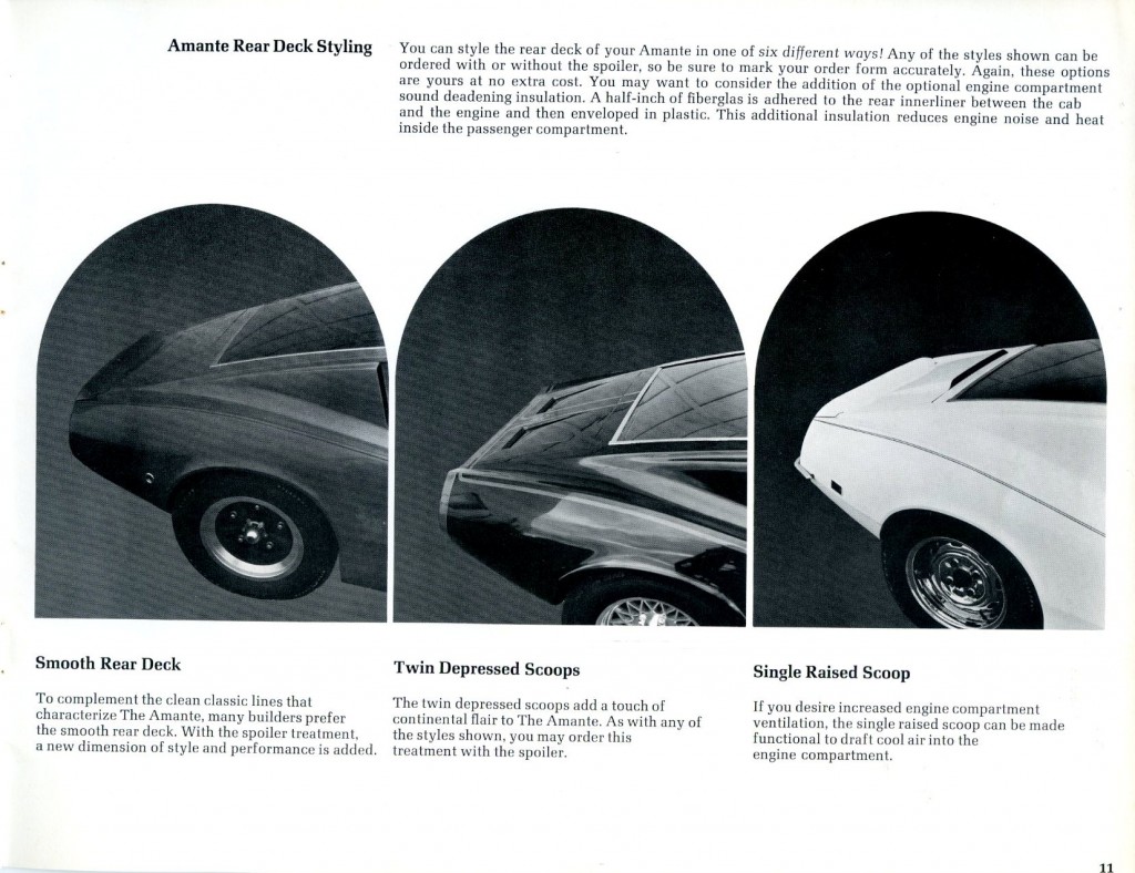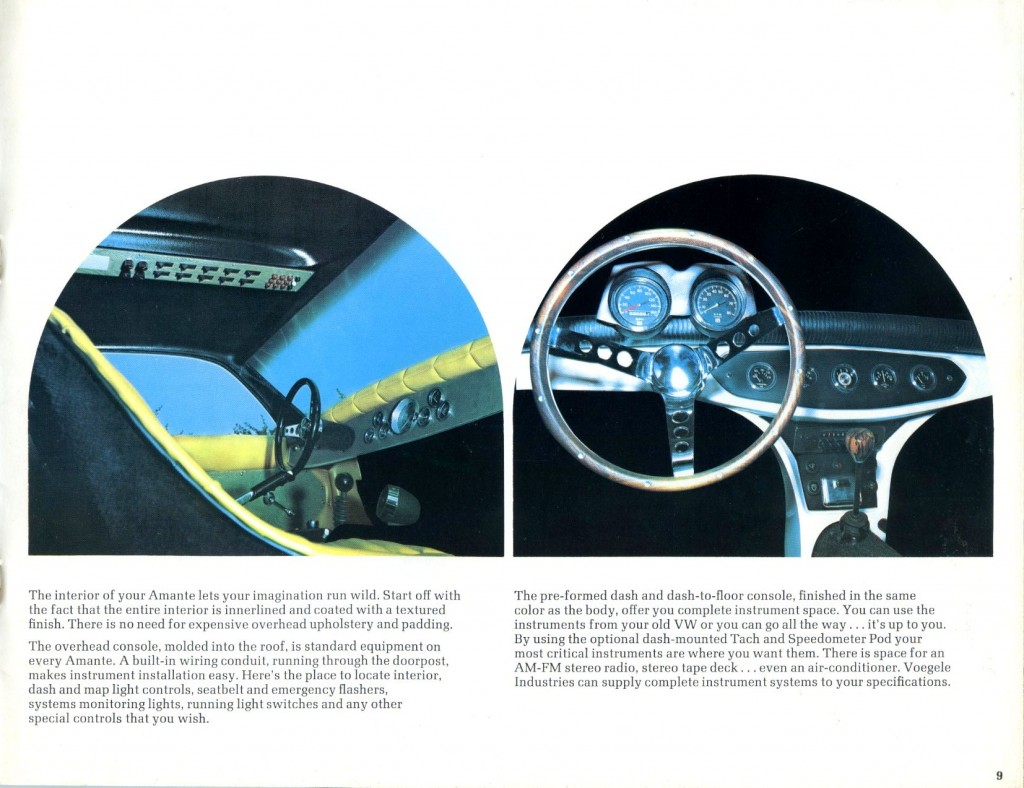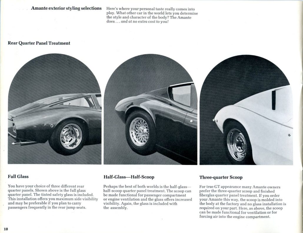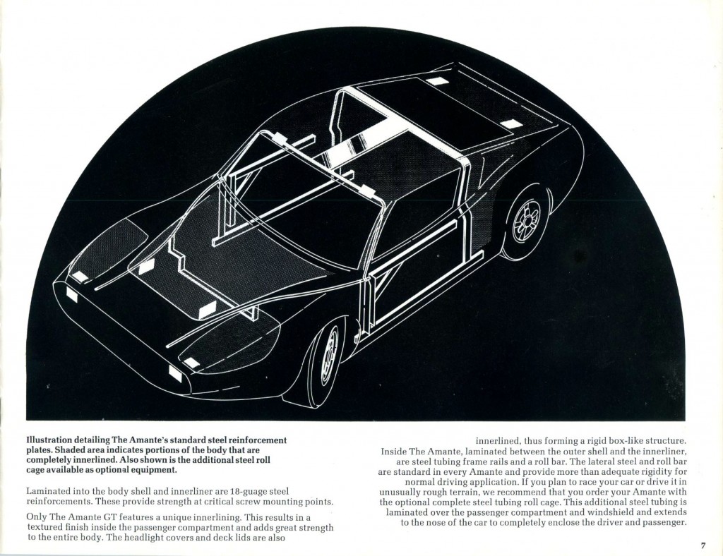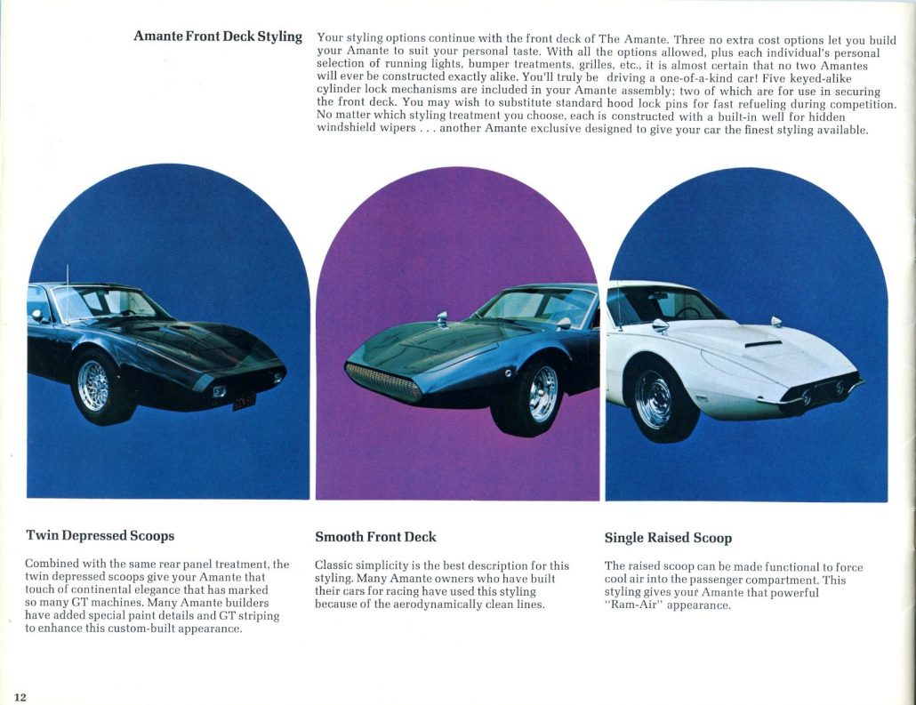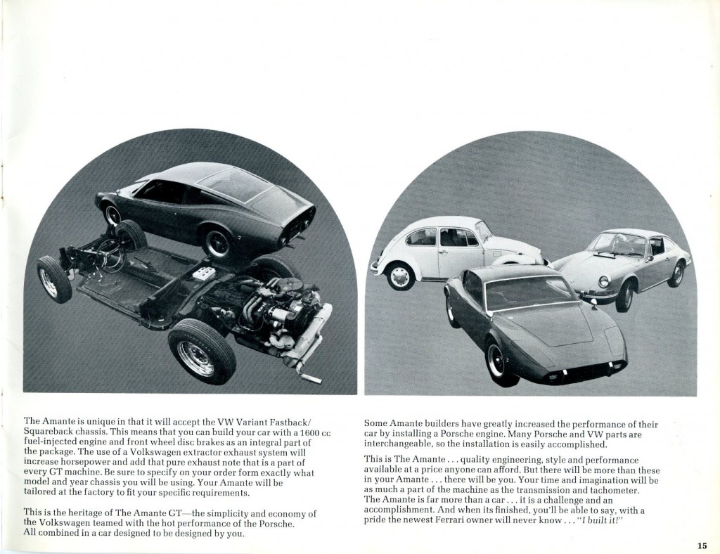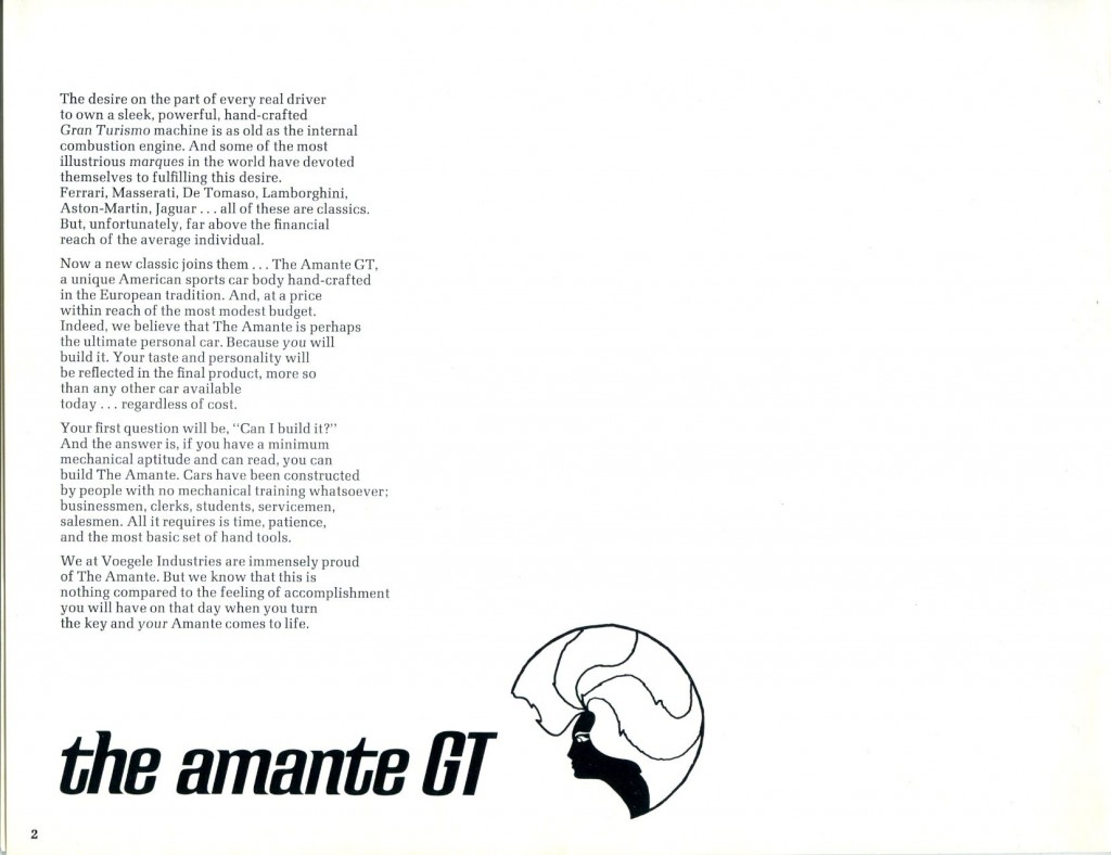 During my recent travels during the Christmas holidays of 2011, I spent some time with Bob Murray of North Carolina. Bob was kind enough to lend material from his extensive literature collection, and when I saw the beautiful Amante GT catalog from ‘69/’70, I knew I had to share it with everyone here at Forgotten Fiberglass.