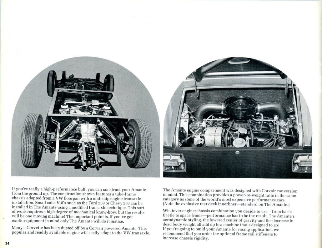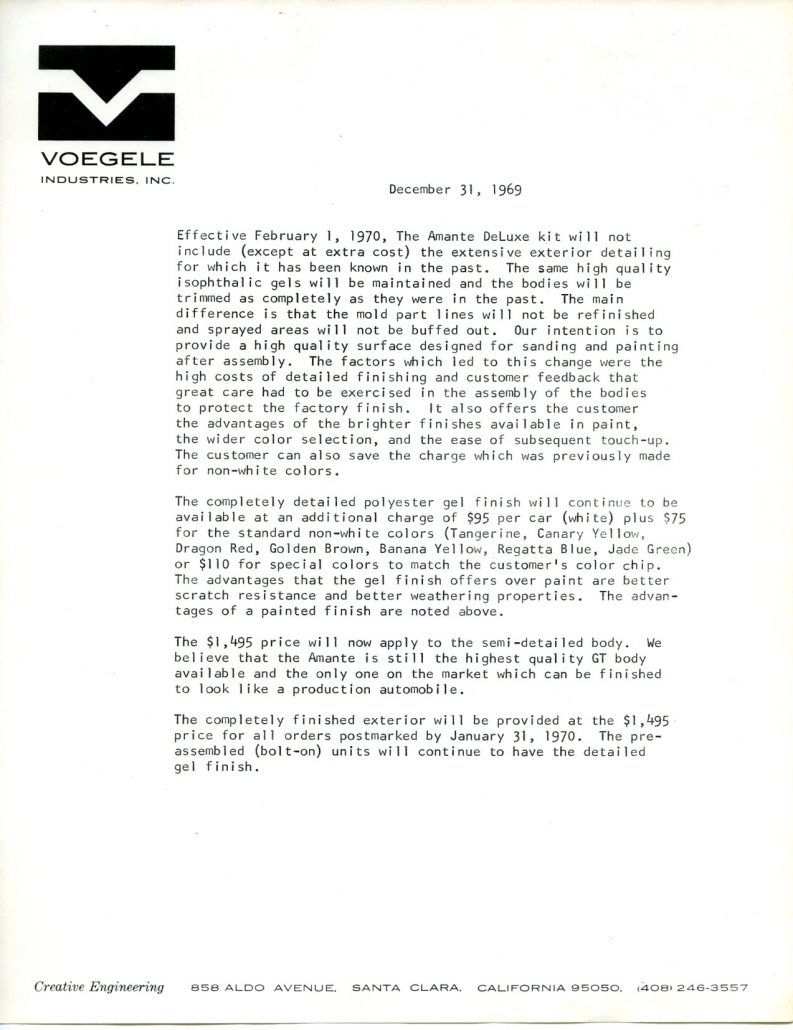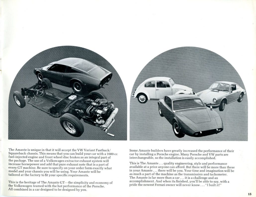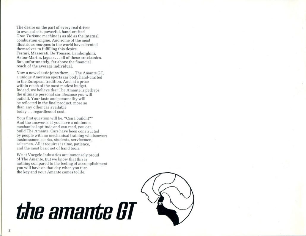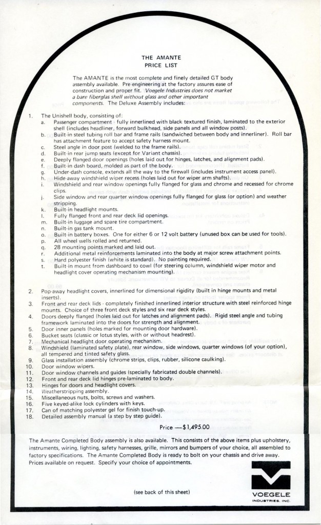 I worked at Vogele Ind. for a short time in 1970, my brother was shop forman at the time these cars were very well constructed for their time, you could build an 11 sec, car for about $3000. That would upset a lot of cars for that era. I believe that a Amante Gt held the land speed record for a 2 seater sports car under 2000cc (1826cc) at 153.77 mph for a long time. Later it was produced in Brazil I believe Bill made the deal under license to mate up with a rotary 90hp aircraft engine. All I can say was it was a fun time.