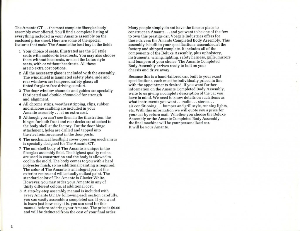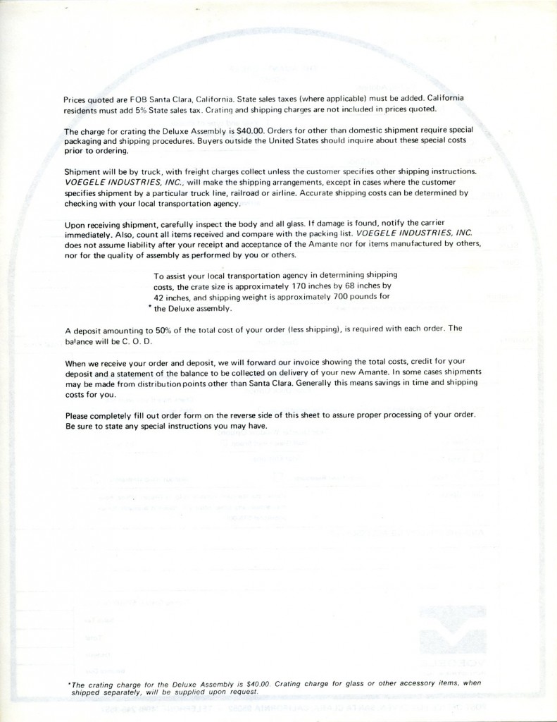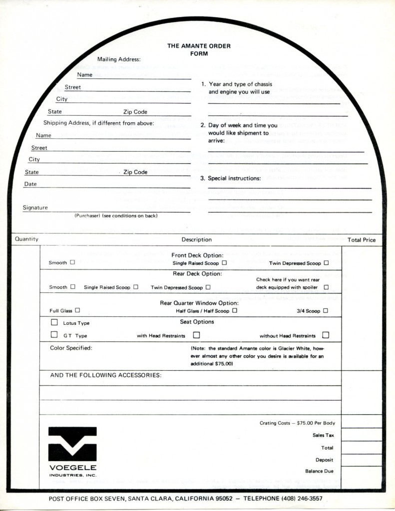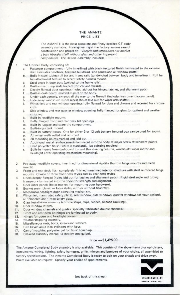 The next series of images is from the brochure (8 and ½ by 11 inches in size) and associated paperwork from the collection of Bob Murray. These show in totality what was received when you ordered the full brochure pack from Voegele Industries for the Amante GT sports car. As always, you can click on any of the images below and a larger image will appear on your screen.