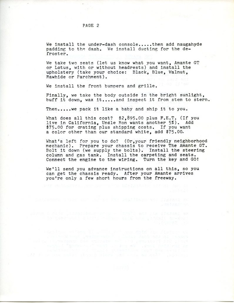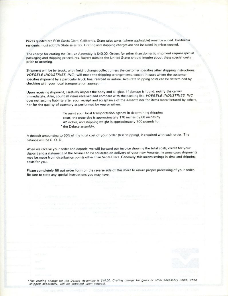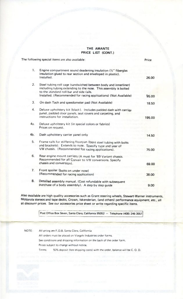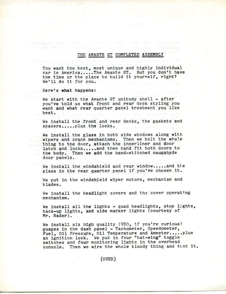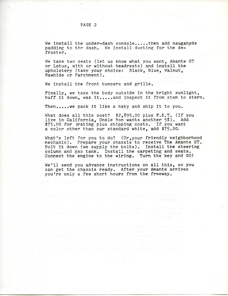 The next series of images is from the brochure (8 and ½ by 11 inches in size) and associated paperwork from the collection of Bob Murray. These show in totality what was received when you ordered the full brochure pack from Voegele Industries for the Amante GT sports car. As always, you can click on any of the images below and a larger image will appear on your screen.