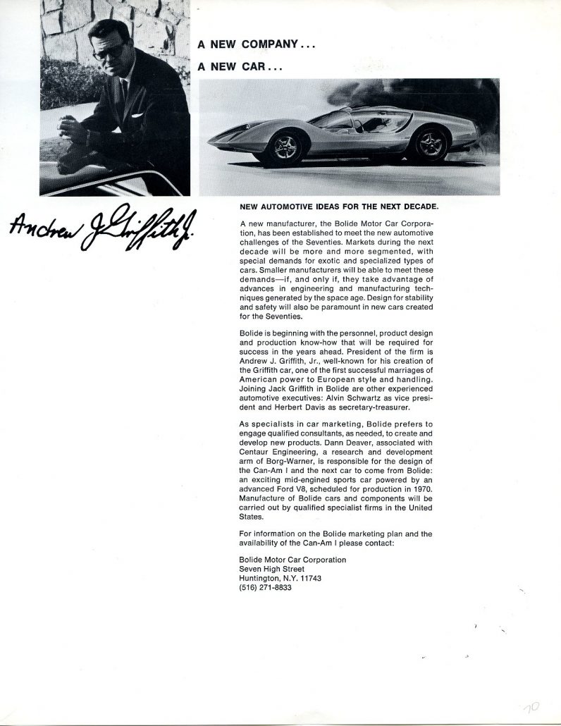 A new manufacturer, the Bolide Motor Car Corporation, has been established to meet the new automotive challenges of the Seventies.  Markets during the next decade will be more and more segmented, with special demands for exotic and specialized types of cars.
