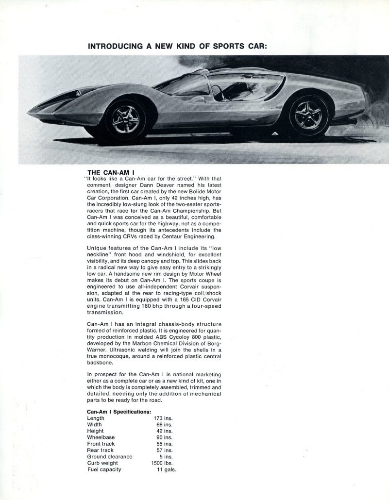 Dan Deaver, associated with Centaur Engineering, a research and development arm of Borg-Warner, is responsible for the design of the Can-Am 1 and the next car to come from Bolide: an exciting mid-engined sports car powered by an advanced Ford V8, scheduled for production in 1970.
