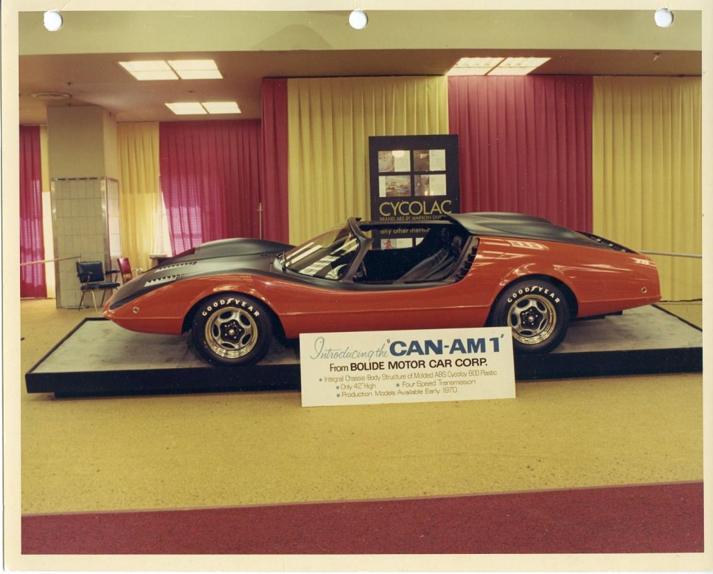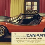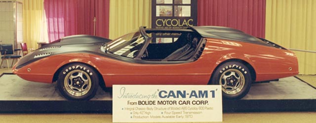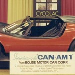That is, information about new cars – cars that I have not heard of before built in fiberglass or forms of plastic where creativity shows no bounds.  And that’s what happened when I stumbled upon a 2-sided brochure from the Bolide Motor Car Corporation advertising the Cycolac / plastic based car – the Cam Am 1 – on eBay earlier this month.