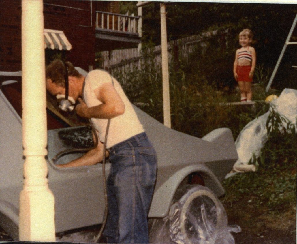 Pictures taken during the early days of construction show the car had its beginnings on a large sheet of plywood placed atop two wooden sawhorses used in carpentry work. Mr. Brantner, a welder employed at Cumberland Welding and Supply Company, was able to use his normal work skills for fabricating the metal frame, but the fiberglass used to mold the car’s body was a new experience for him, he said.