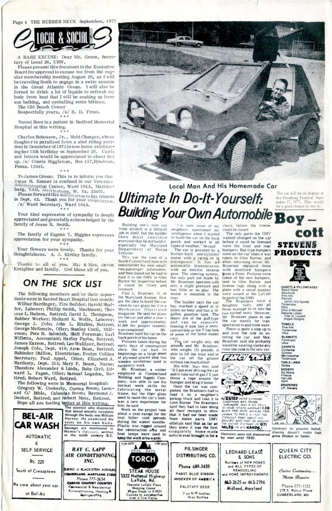 Back in the 1970’s, Paul Brantner’s Urbacar appeared in at least two local newspapers: “The Cumberland News” on August 22, 1977 and “The Rubber Neck” (published monthly by Local 26, URCLPWA) in September 1977. Both papers are from Cumberland, Maryland, and the articles were identical in each paper. This is a great piece about a car that was built at a time when gas was thought to increase to as much as 60 cents a gallon. Here’s the article for your review: